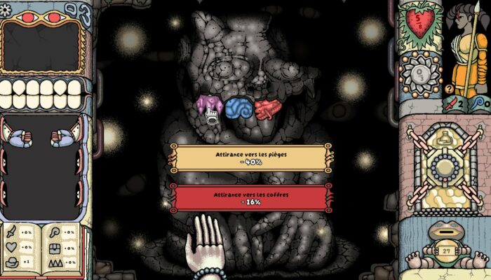 Le concept est poussé assez loin pour qu’on ne se lasse pas trop vite. Tous les monstres ne se comportent pas de la même manière : certains se contentent d’être de simples murs de stats à contourner, tandis que d’autres viennent régulièrement vous voler vos précieux coffres, changent leur affinité (force ou magie), montent en puissance au fil des tours… et plus encore. Cette variété fait le sel de Sol Cesto, qui évite soigneusement de tomber dans une routine paresseuse. Rien n’est jamais acquis, et les situations s’enchaînent sans jamais trop se ressembler.