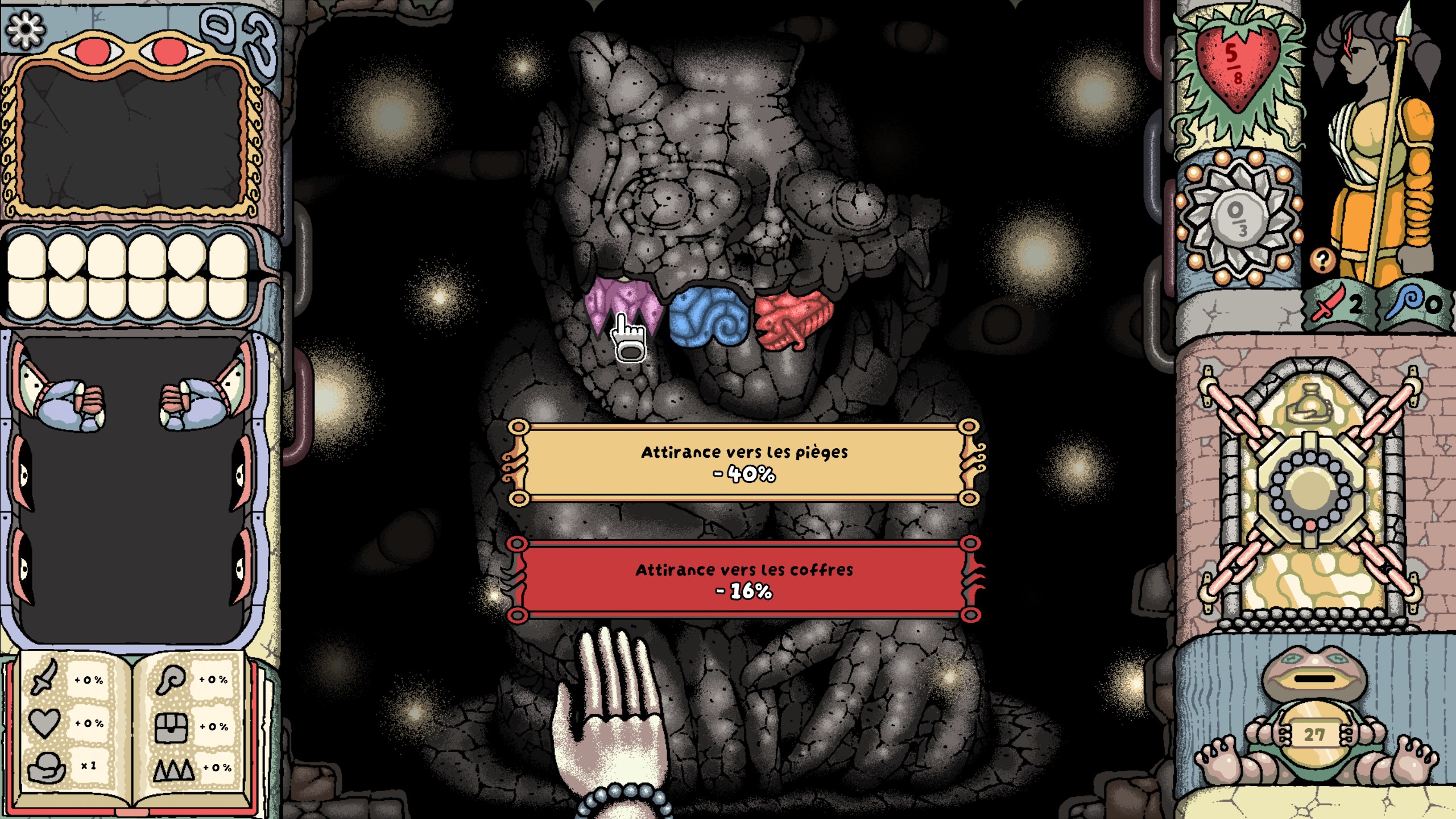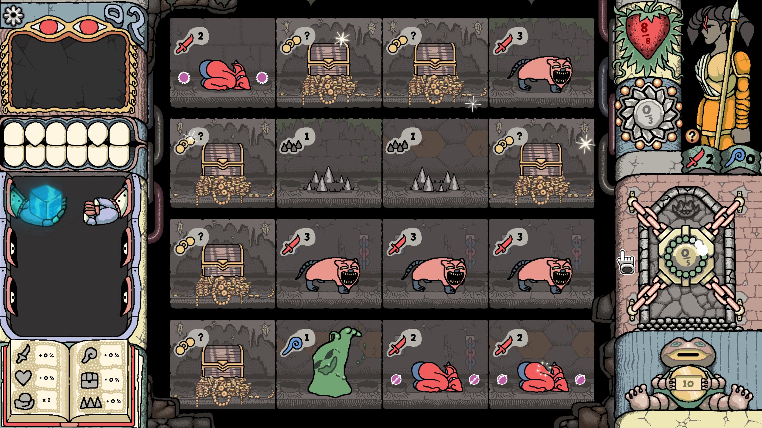 Le concept est poussé assez loin pour qu’on ne se lasse pas trop vite. Tous les monstres ne se comportent pas de la même manière : certains se contentent d’être de simples murs de stats à contourner, tandis que d’autres viennent régulièrement vous voler vos précieux coffres, changent leur affinité (force ou magie), montent en puissance au fil des tours… et plus encore. Cette variété fait le sel de Sol Cesto, qui évite soigneusement de tomber dans une routine paresseuse. Rien n’est jamais acquis, et les situations s’enchaînent sans jamais trop se ressembler.