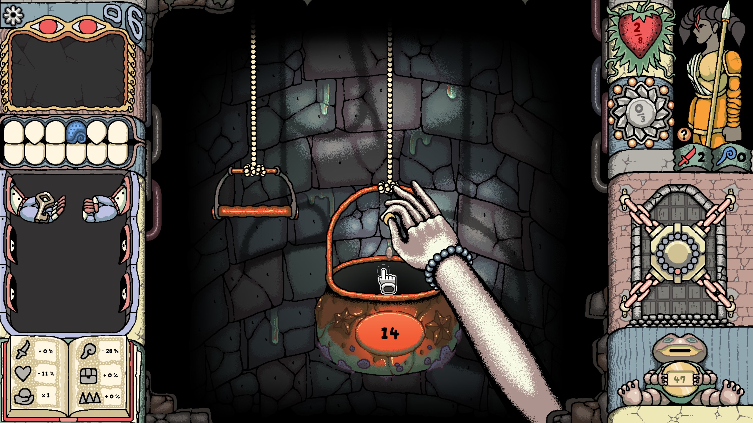 De même, le système de méta progression repose exclusivement sur l’or récupéré pendant les runs… encore faut-il réussir à en ramener vivant. Régulièrement, le jeu nous propose de déposer des pièces dans une marmite magique qui remontera à la surface si tout se passe bien. Enfin, « si tout se passe bien », ça signifie souvent renoncer à un achat vital chez le marchand, et donc se mettre délibérément en danger pour gratter un peu de progression.