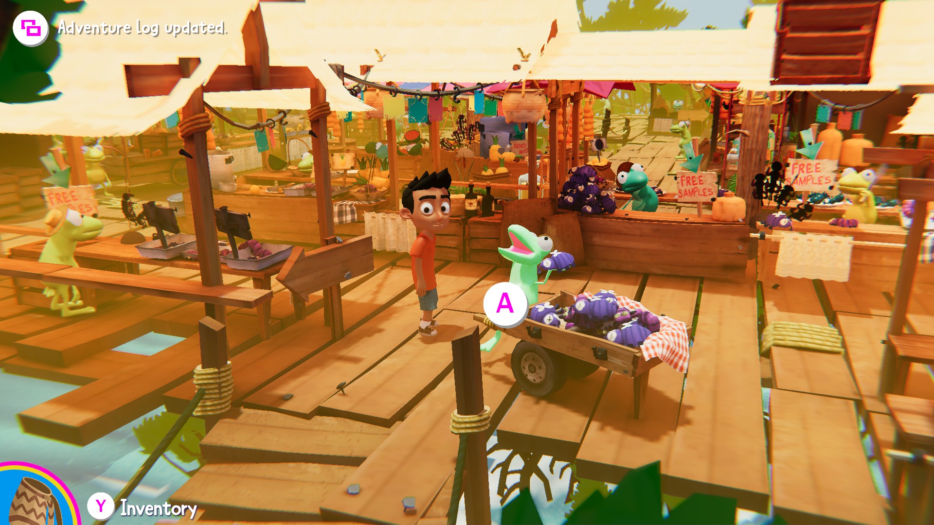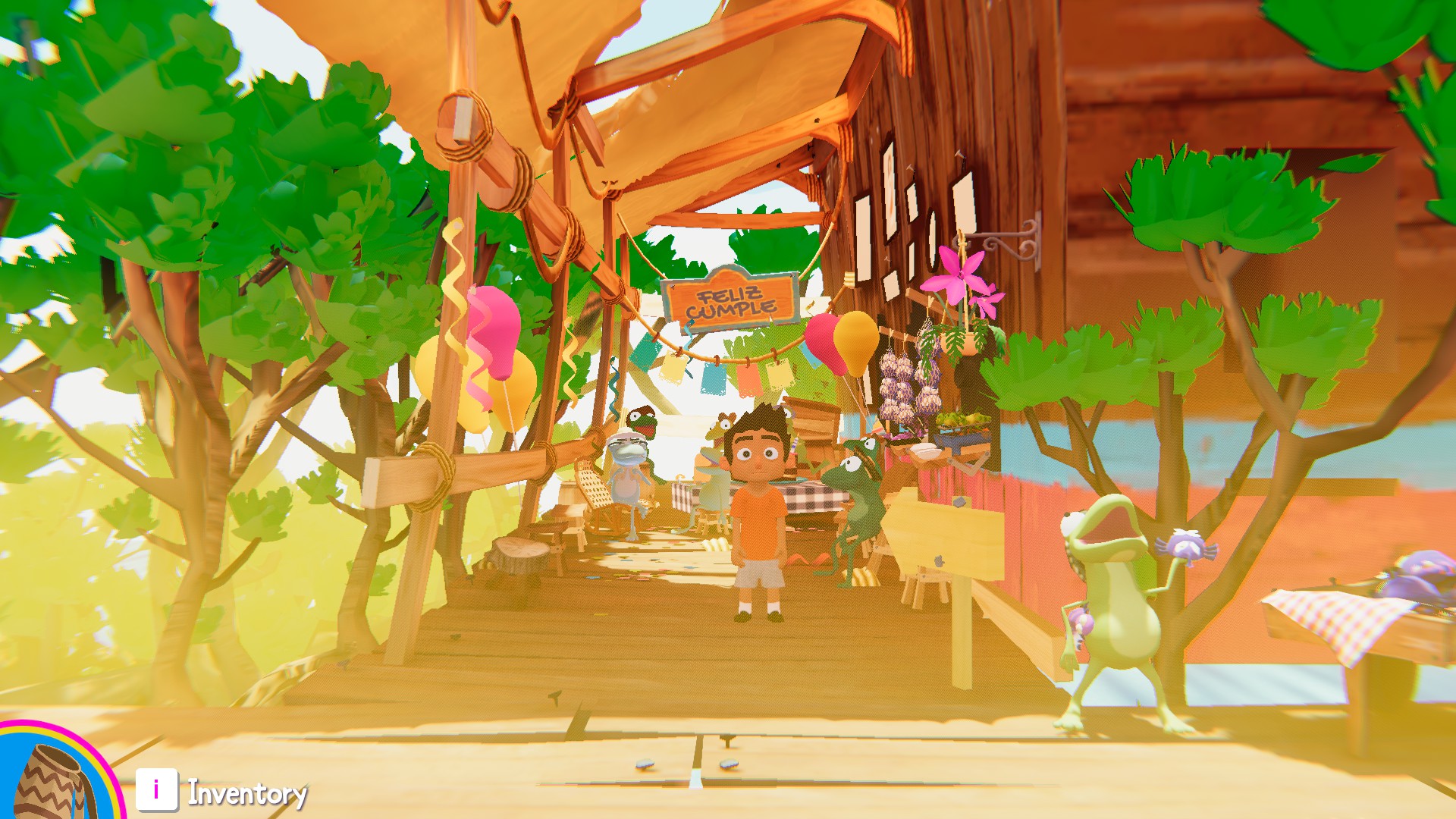 Les créateurs de SOPA disent s’être inspiré de Coco (Pixar) et du Voyage de Chihiro (Ghibli), et c’est exactement cette atmosphère qui nous a séduit tout au long de l’aventure. L’héritage familial et la transmission, la culture sud-américaine, mais aussi le périple dans un monde magique, dont on n’est jamais sûr de la vraie nature (rêve, imagination débordante d’un petit garçon qui s’amuse, ou vrai lieu dans lequel les grenouilles sont douées de parole ?). L’ambiance est l’une des plus grandes réussites du jeu, qui nous embarque tout de suite comme le ferait un bon dessin-animé qu’on aimerait redécouvrir même à l’âge adulte.