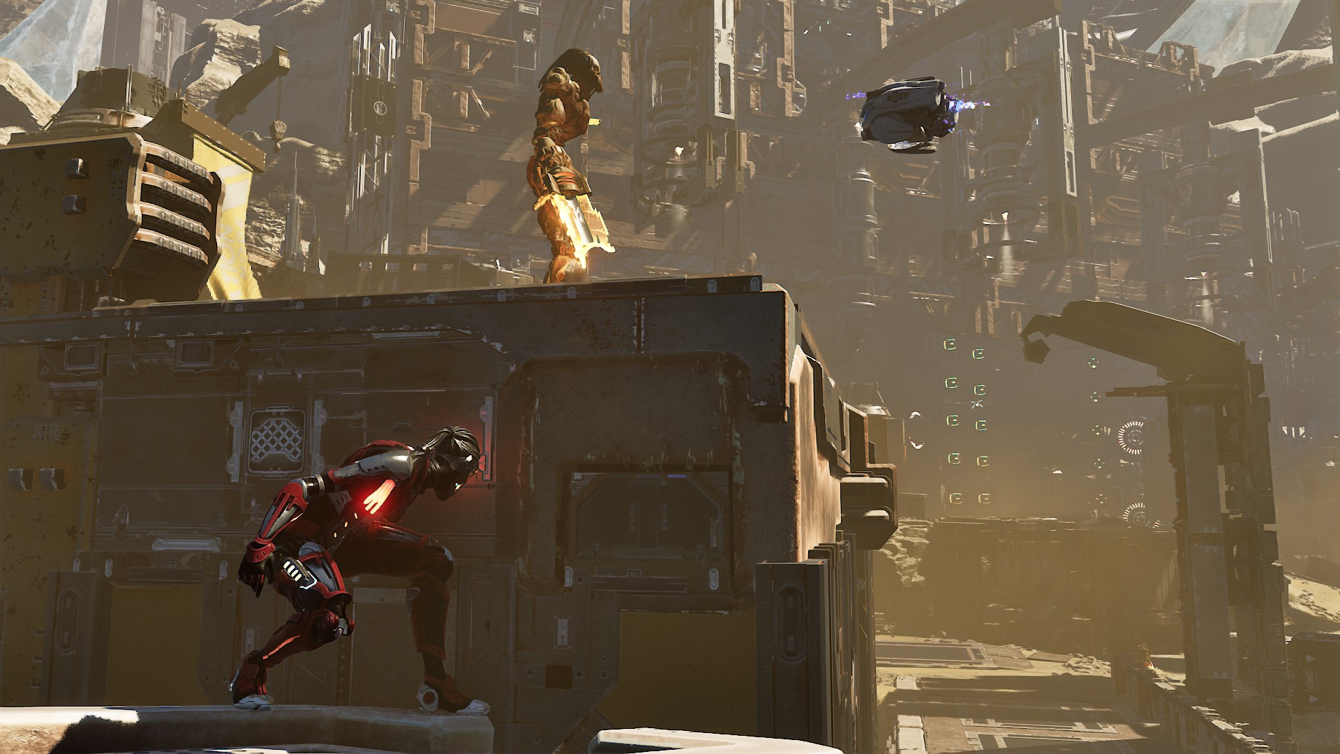 La mise en scène et le gameplay sont ponctués de scènes que l’équipe de développement a baptisées « Michael Bay » en raison de leur caractère explosif ! Des passages plutôt fun de course contre la montre dans lesquels tout pète, les décors s’effondrent… Des virgules bienvenues qui viennent casser le rythme plateforme-arène-plateforme-arène-plateforme…