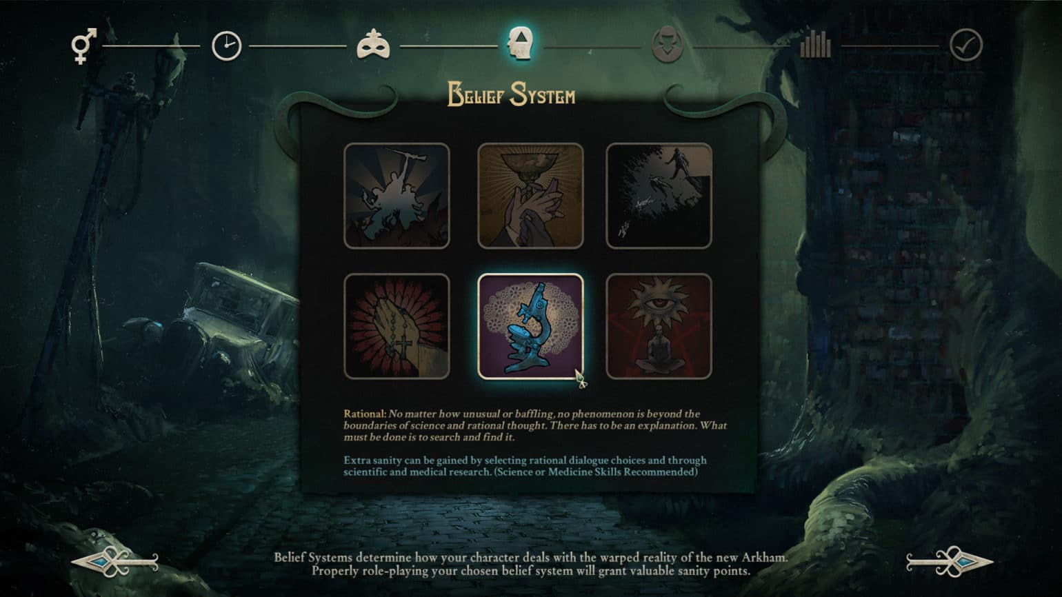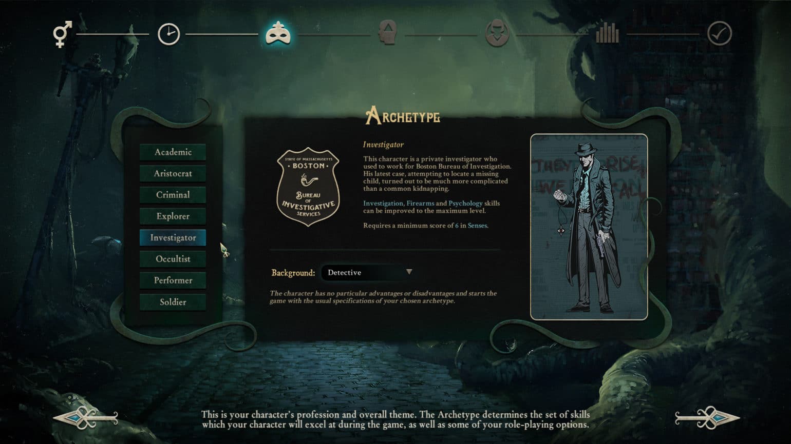 Pour le reste, Stygian: Reign of the Old Ones est une belle adaptation de l’univers lovecraftien, et spécifiquement celui du jeu de rôle sur table L’Appel de Cthulhu. Le jeu démarre en effet par une création de personnage dans les règles de l’art, où il s’agira de choisir genre, nom, classe (détective privé, militaire, flic… chacun avec ses bonus et malus), avant de répartir un nombre de points de base parmi une série de caractéristiques.