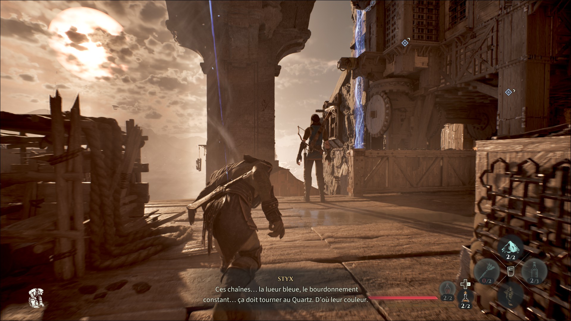 Si le gameplay brille par sa générosité, tout ce qui l’entoure peine à suivre. Le scénario et sa narration n’ont clairement pas bénéficié du même soin. Notre seul objectif jusqu’à la toute fin ne se résume qu’à « Trouver le Quartz à tel endroit », ponctué d’objectifs connexes comme espionner des gardes ou trouver un levier cassé. Chaque absorption de Quartz vous vaudra un échange avec le Flux, cette entité qui s’obstine à poser des questions existentielles auxquelles Styx refuse de répondre — et dont on finit par partager l’agacement.