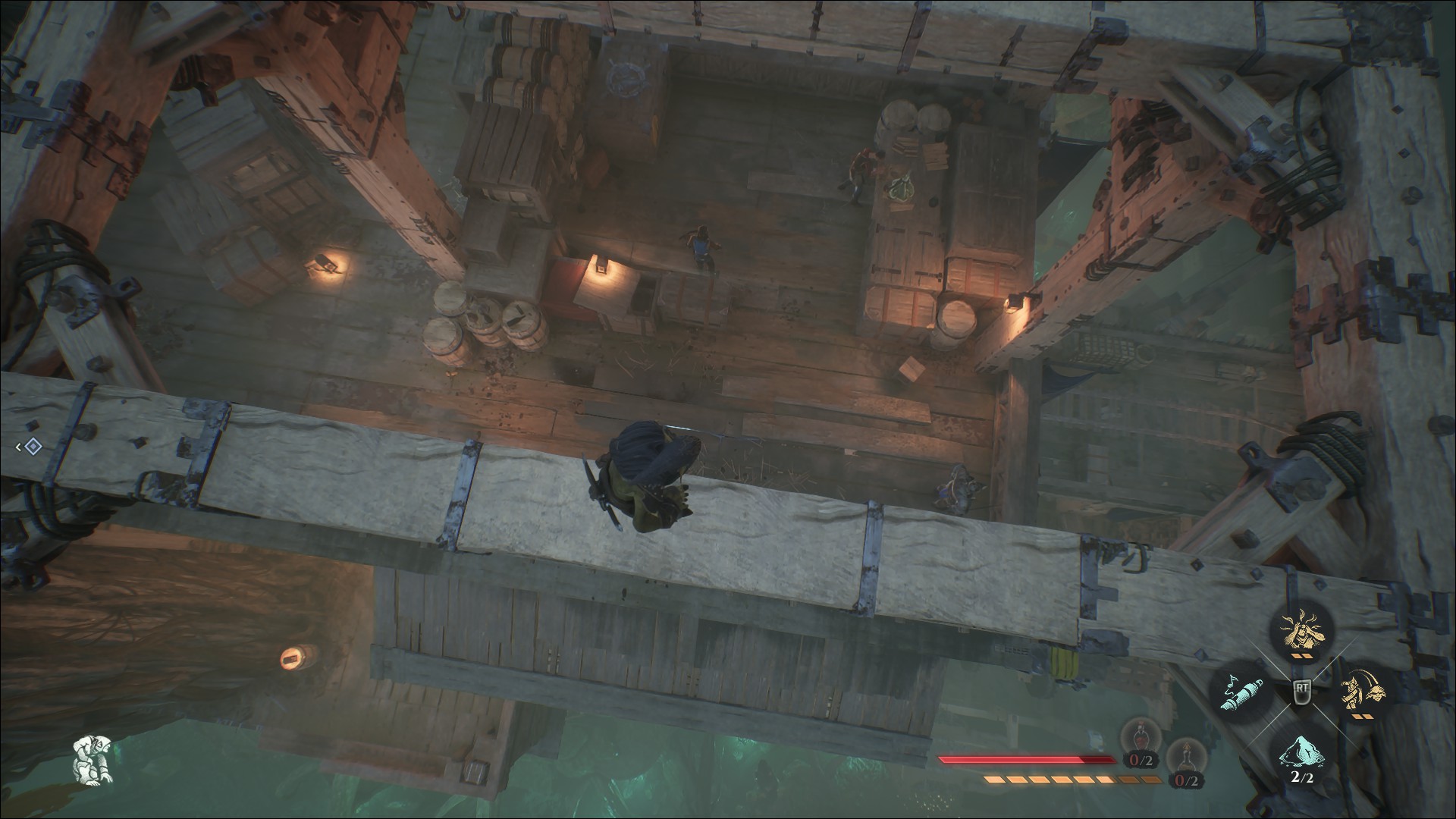 On découvre alors un jeu d’infiltration au level design absolument remarquable, avec le déblocage progressif de nouveaux outils de mobilité tels que le grappin, le parachute et d’autres surprises. Ces outils ouvrent de nouvelles zones dans des environnements déjà explorés, conférant au jeu une dimension Metroidvania particulièrement gratifiante. Revenir au Mur avec le grappin, c’est redécouvrir un lieu que l’on pensait connaître. Rares sont les jeux d’infiltration qui osent emprunter cette structure et plus rares encore sont ceux qui la maîtrisent aussi bien.