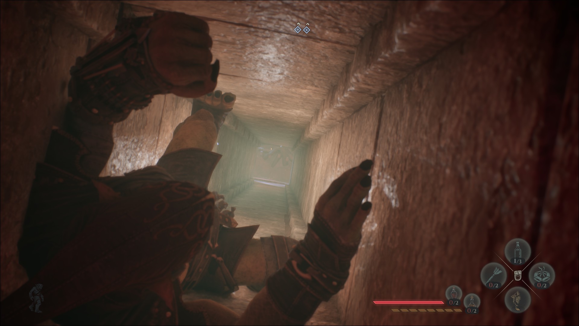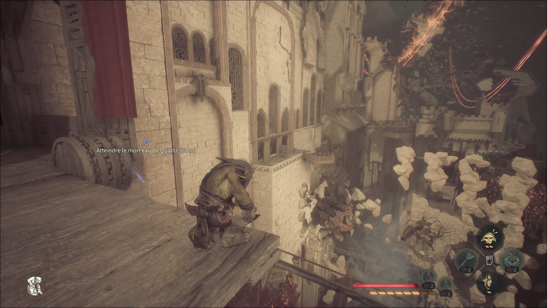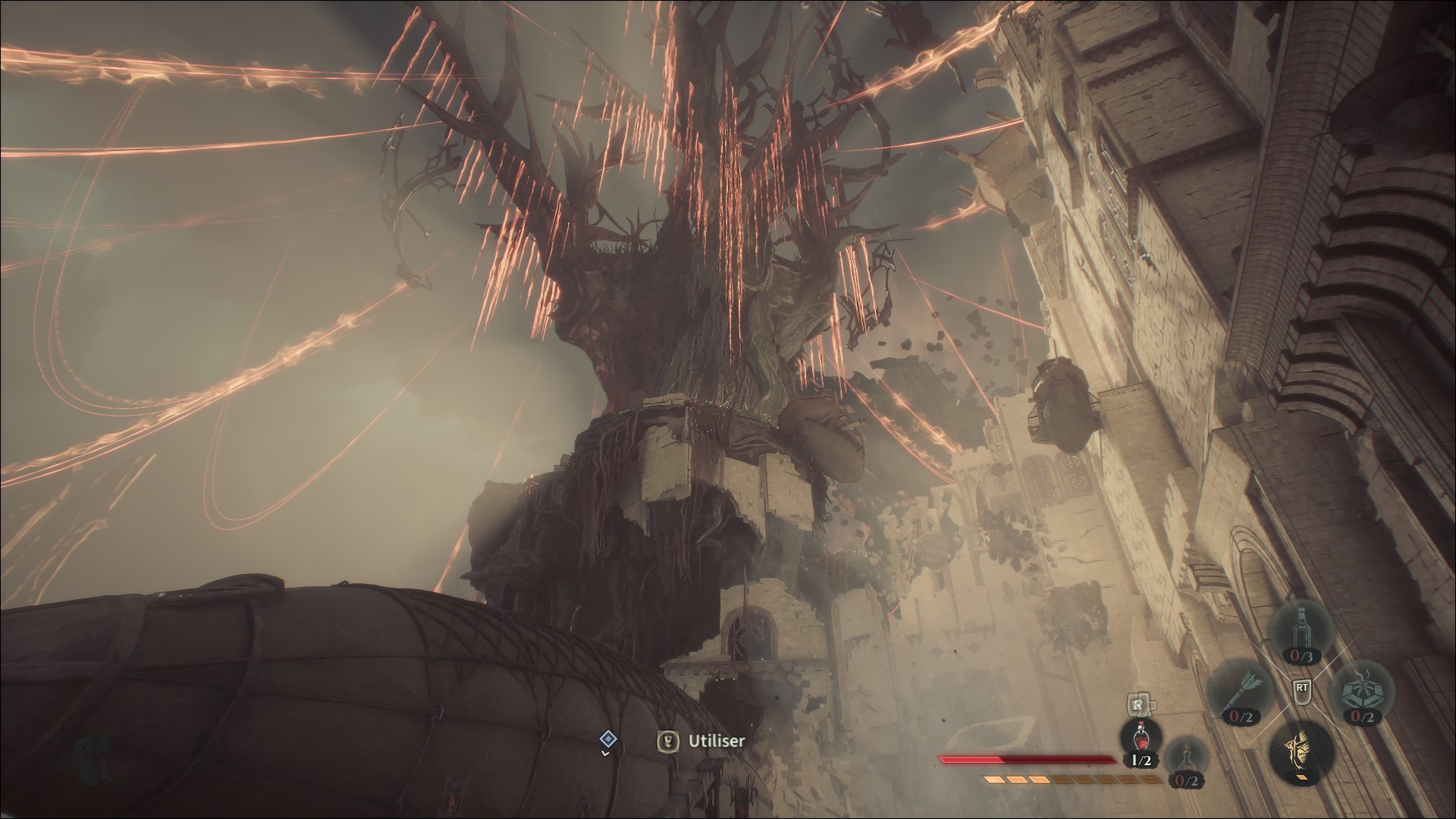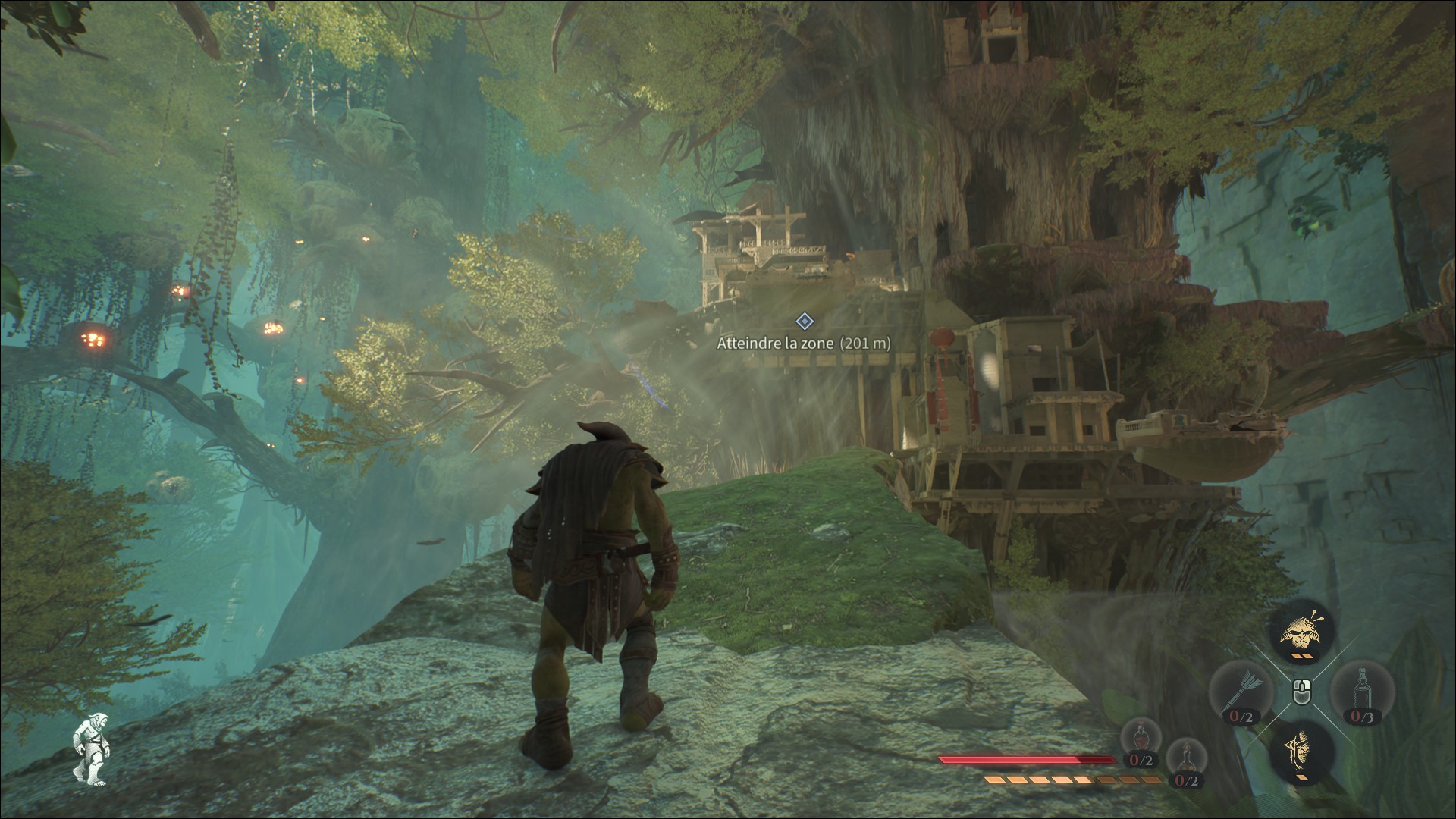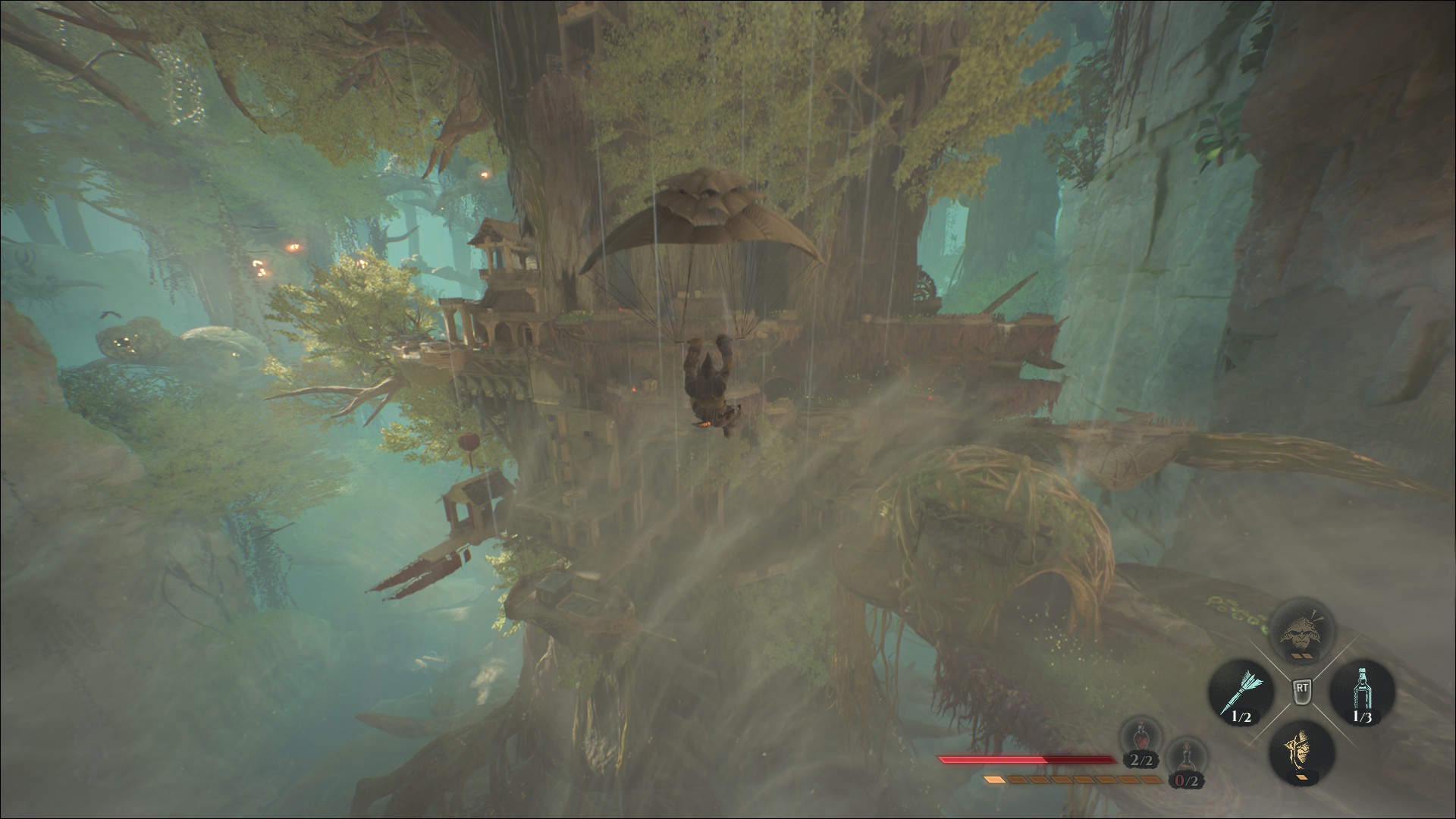 Cette ambition a toutefois un revers. Le jeu ne dispose d’aucune carte ni boussole. On s’appuie sur la peinture jaune signalant les points d’accroche du grappin et sur la vision d’ambre, qui met en surbrillance les éléments interactifs. Dans les deux premiers actes, cela suffit. Mais à partir de l’acte 3, lorsque le grappin et le parachute ouvrent considérablement les environnements, ces aides deviennent insuffisantes face à l’ampleur des niveaux. On s’est retrouvé bloqué à plusieurs reprises, sans comprendre où aller.