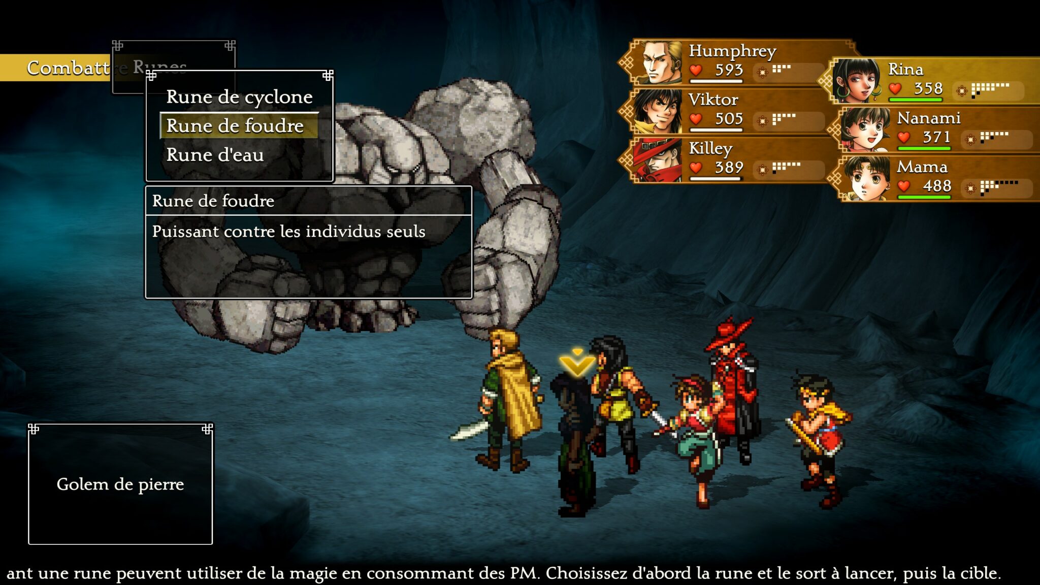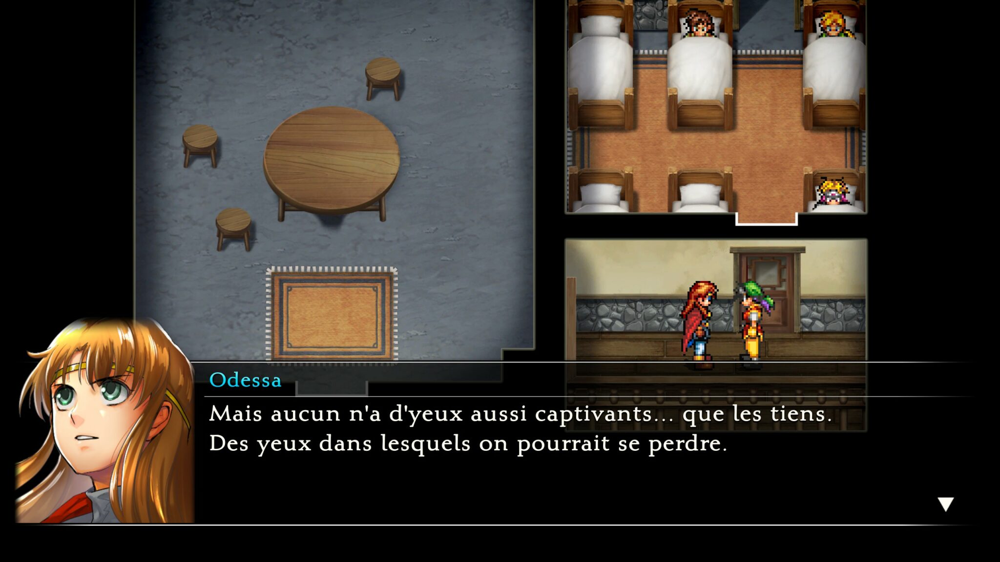 Saluons l’effort de variété dans les mécaniques : les duels et les batailles d’armée viennent casser le rythme classique des J-RPG de l’époque en ponctuant les événements importants de l’histoire. Même si ça reste très simpliste en se basant sur un système de pierre-feuille-ciseaux.