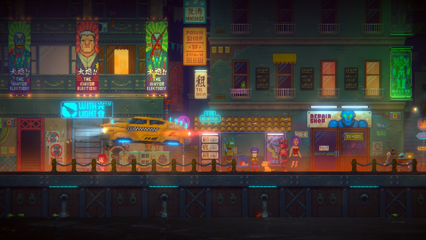 Nous n’avons pas encore parlé de l’esthétique du jeu, bien que les photos parlent d’elles-mêmes, tout en pixels. Ce style graphique le rapproche encore plus des Monkey Island ou autre Indiana Jones and the Fate of Atlantis. Superbement exécuté, le pixel art du jeu regorge de détails (les miroirs qui « fonctionnent » !) et d’effets. À commencer par la lumière. Le jeu porte en effet son titre comme un étendard : des néons, il y en a partout ! L’univers du jeu rappelle ainsi furieusement Blade Runner, avec ses rues, les mers de néons du titre, aussi éclatantes de lumières qu’elles abritent leur part des ténèbres. Les néons, donc, les cyborgs et autres androïdes à tous les coins de rues, les taxis volants… Nous sommes en plein dans le futur cyberpunk de Blade Runner. D’ailleurs, le héros lui-même a des faux airs de Deckard !