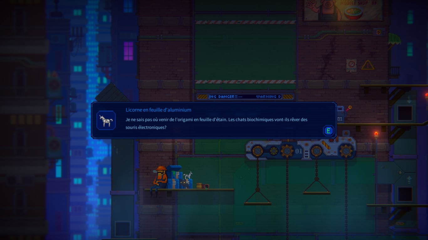 S’il est d’ailleurs à peu de choses près nommément cité, Blade Runner n’est pas la seule référence convoquée par Tales of the Neon Sea. Partout, tout le temps, de petits détails rappellent des monuments de la pop culture. On a évoqué le robot, sosie de Johnny 5, ici ce sera un poster de Lost, là une ligne de dialogue à destination des fans d’Harry Potter… On a presque un «jeu dans le jeu», façon Où est Charlie ? Le souci, c’est qu’entre les alignements de références et ceux de clichés, il ne reste plus beaucoup de place au jeu pour s’exprimer.