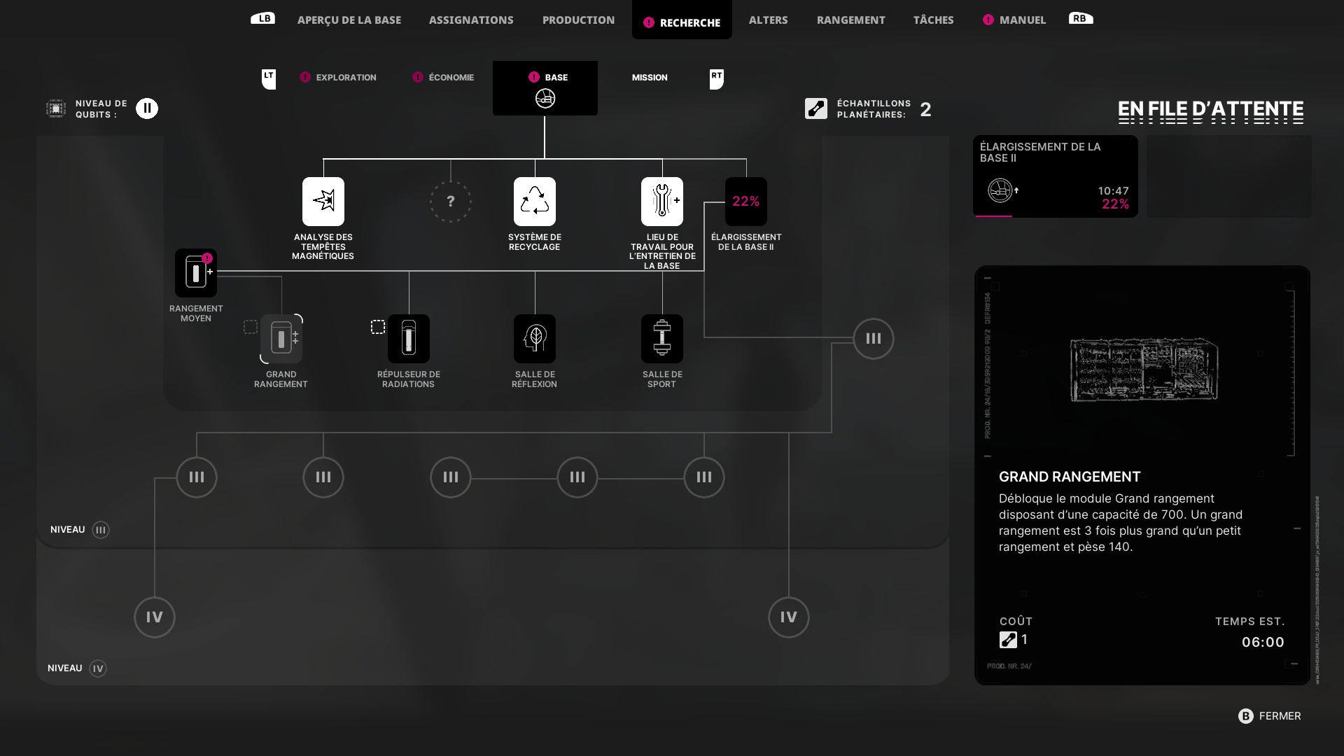 Au gré des recherches et des accumulations de matériaux, on pourra installer de nouveaux containers donnant de nouvelles possibilités à la base : stockage plus important, lieu de repos pour soigner le moral des clones, infirmerie, …