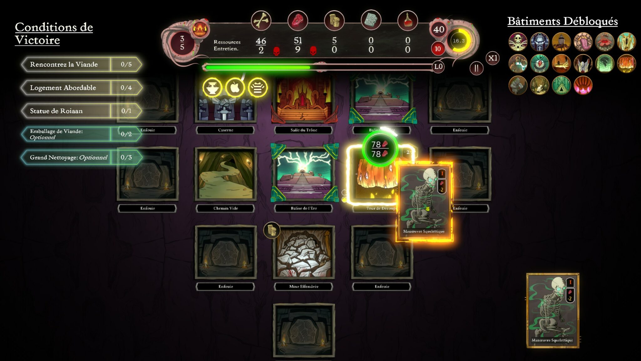 Et des échecs, vous en connaîtrez. Le jeu est exigeant et adore vous surprendre avec des événements imprévus : un groupe d’aventuriers trop zélé, une récolte plus abondante que prévu… Ce genre d’aléatoire maintient une tension constante dans la gestion du donjon, mais peut aussi mener à des impasses brutales. Une défaite que vous voyez arriver lentement mais qu’il vous est impossible d’éviter, c’est vite frustrant.