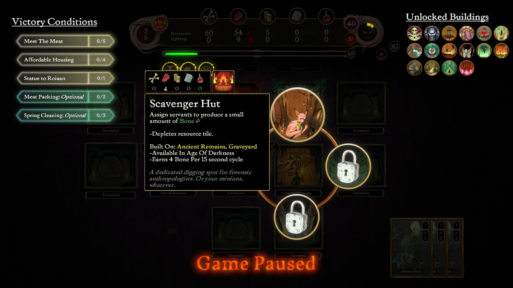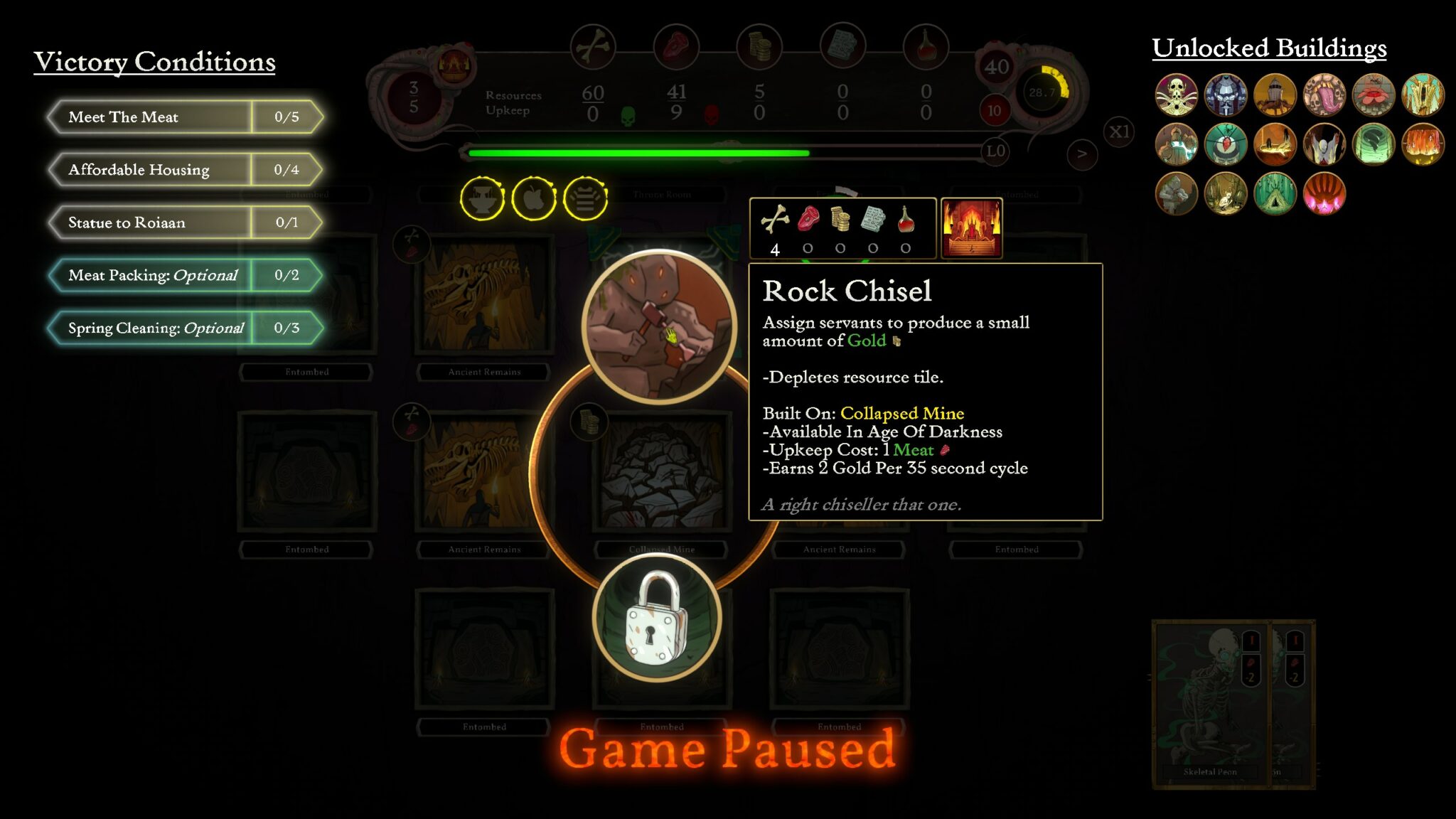 Une fois en jeu, l’objectif est simple en apparence : bâtir la statue de votre divinité tout en répondant aux ponctions régulières de ressources. Deux échecs, et c’est la fin. Pour éviter une mort prématurée, il faudra creuser le terrain à la manière d’un Dungeon Keeper, en espérant tomber sur des zones exploitables. Chaque tuile peut accueillir un certain nombre de bâtiments, où vous devrez assigner des ouvriers pour extraire les précieuses ressources. Ces derniers peuvent même être spécialisés pour optimiser leur rendement. Vous gagnez également de l’expérience qui va servir à améliorer vos bâtiment pendant votre partie.