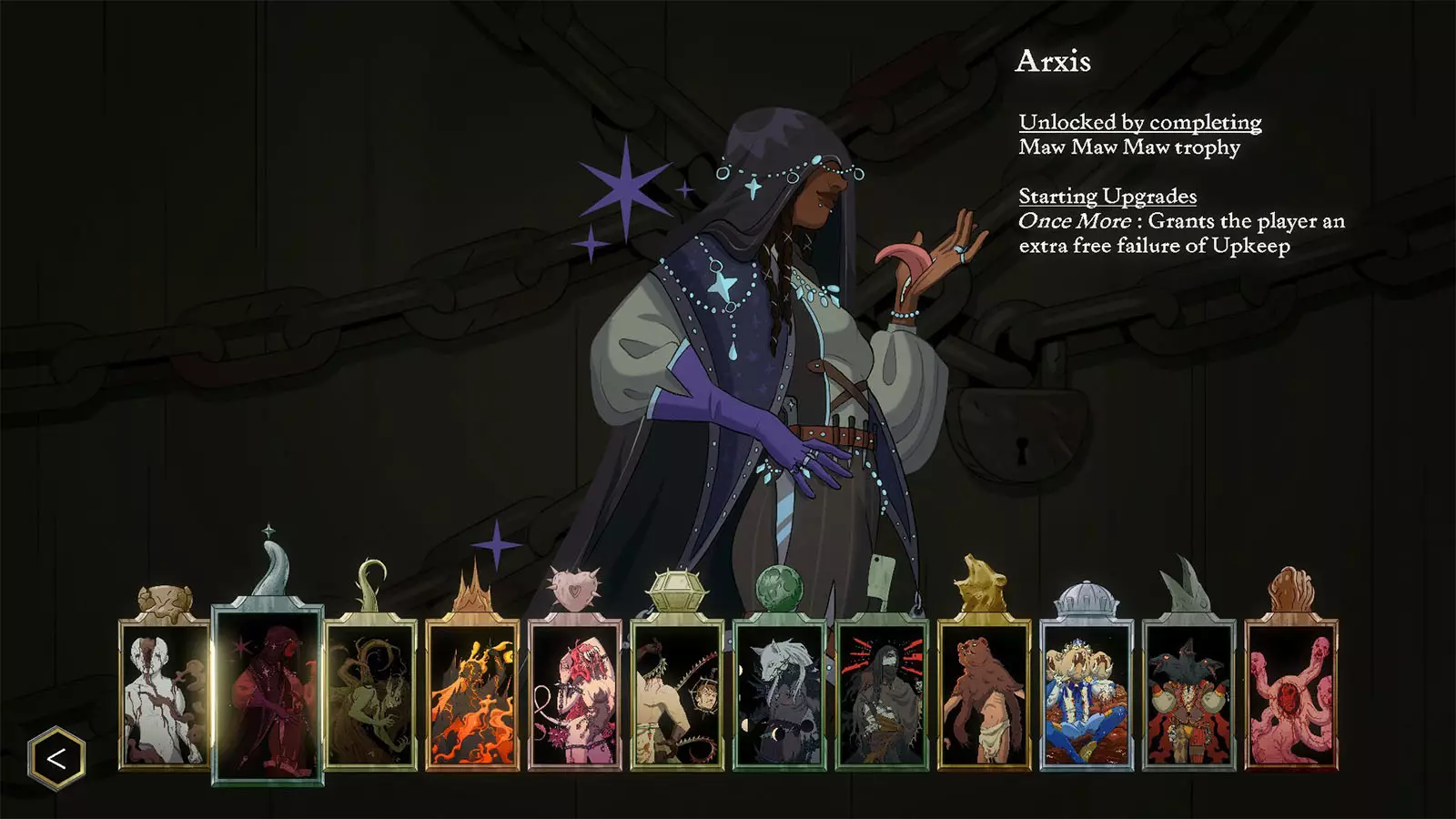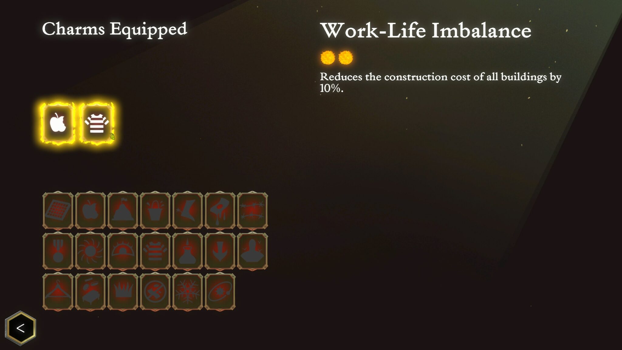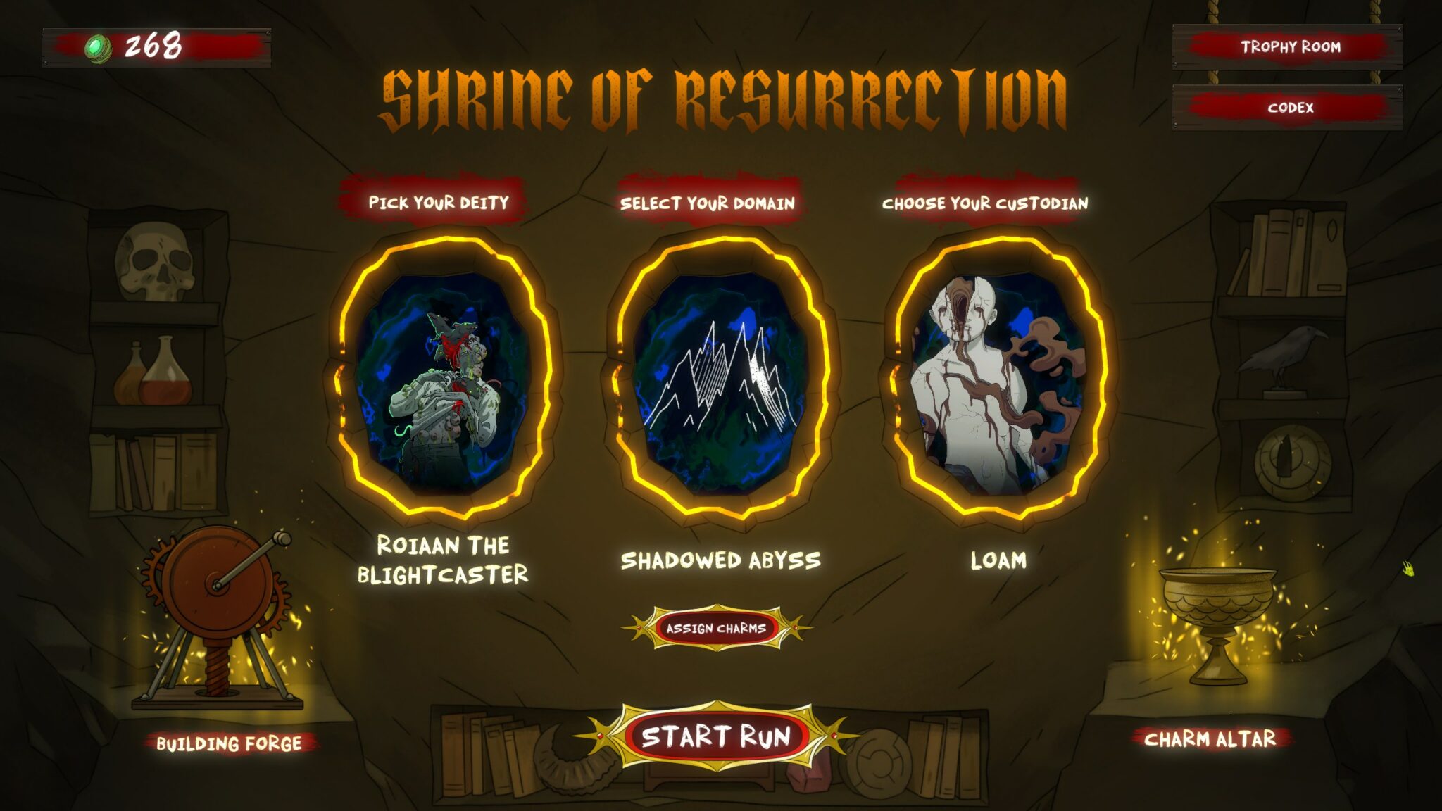 Avant de plonger dans une partie, il faut choisir un dieu du mal, qui définit vos objectifs et ressources de départ, un territoire parmi les quatre disponibles (déterminant la difficulté), ainsi qu’un gardien offrant un petit bonus. Après quelques runs, vous pourrez aussi équiper des charmes, suivant une logique similaire à celle d’Hollow Knight : un budget de trois emplacements et des bonus occupant un, deux ou trois slots. Ces améliorations boostent significativement votre productivité, toujours d’une manière utile.