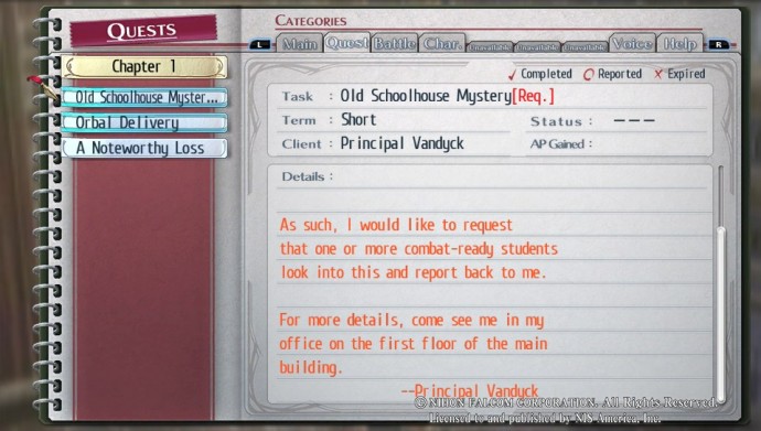 The Legend of Heroes: Trails of Cold Steel vous propulse dans le monde d’Erebonia et vous propose d’incarner le jeune Rean Schwarzer qui entre dans les études supérieures. Il intégrera une toute nouvelle classe, la Classe VII. Le lycée militaire a en effet décidé de créer une classe spéciale dans laquelle seront mélangés les élèves sans distinction de classe sociale. Car à Erebonia la noblesse est très présente et il parait impensable de se mélanger aux roturiers. Cela entraînera quelques frictions entre deux de vos camarades qui sont chacun issus d’une des deux classes. On retrouve également un concept proche de celui de Final Fantasy Type-0 qui proposait au joueur de vivre à la fois la vie estudiantine mais également de participer à des missions en territoire ennemi. Ici, les actions réalisables au lycée vous feront vous rapprocher de vos collègues en passant un peu de temps avec eux tout en remplissant des missions plus ou moins intéressantes en parallèle. Régulièrement vous serez ensuite envoyé dans une région éloignée pour remplir des quêtes et aider des villages. Et le schéma se répète inlassablement. Le joueur attendra longtemps avant que le scénario commence à démarrer. Et c’est là le premier point noir du titre puisque faire le coursier est sympathique mais l’histoire n’avançant qu’à pas d’escargot, le joueur impatient aura vite fait de se lasser. Dommage. Mais il faut savoir que The Legend of Heroes: Trails of Cold Steel est le premier d’une saga et qu’il place à la fois l’histoire et les personnages en vu d’un deuxième volet beaucoup plus développé scénaristiquement.