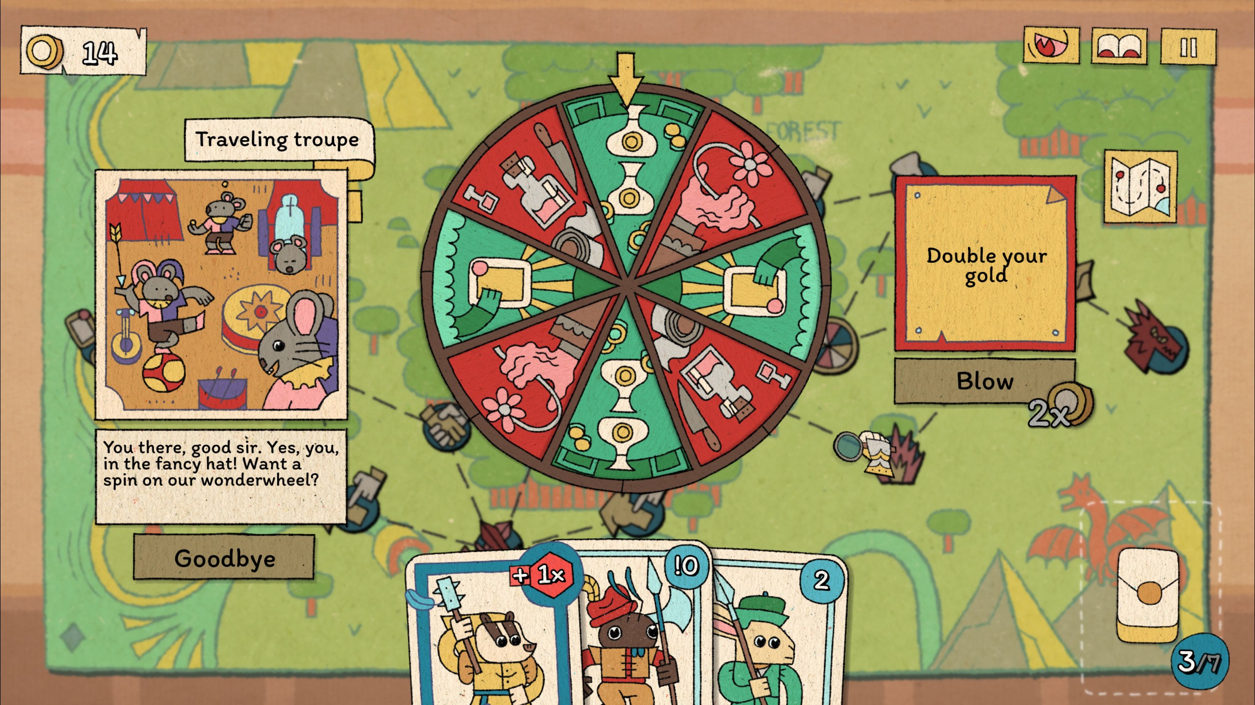 Lors d’un événement aléatoire où il faut faire tourner une roue pour gagner une récompense, le roi peut, par exemple, acheter le forain pour éviter l’infortune en le faisant souffler un peu sur la roue. Les images sont régulièrement légendées avec de petites boutades comme « Image à titre informatif, le roi n’a jamais traversé le fleuve en bateau ». On sent que la majorité du travail a été consacrée aux finitions… Et ça fait du bien.