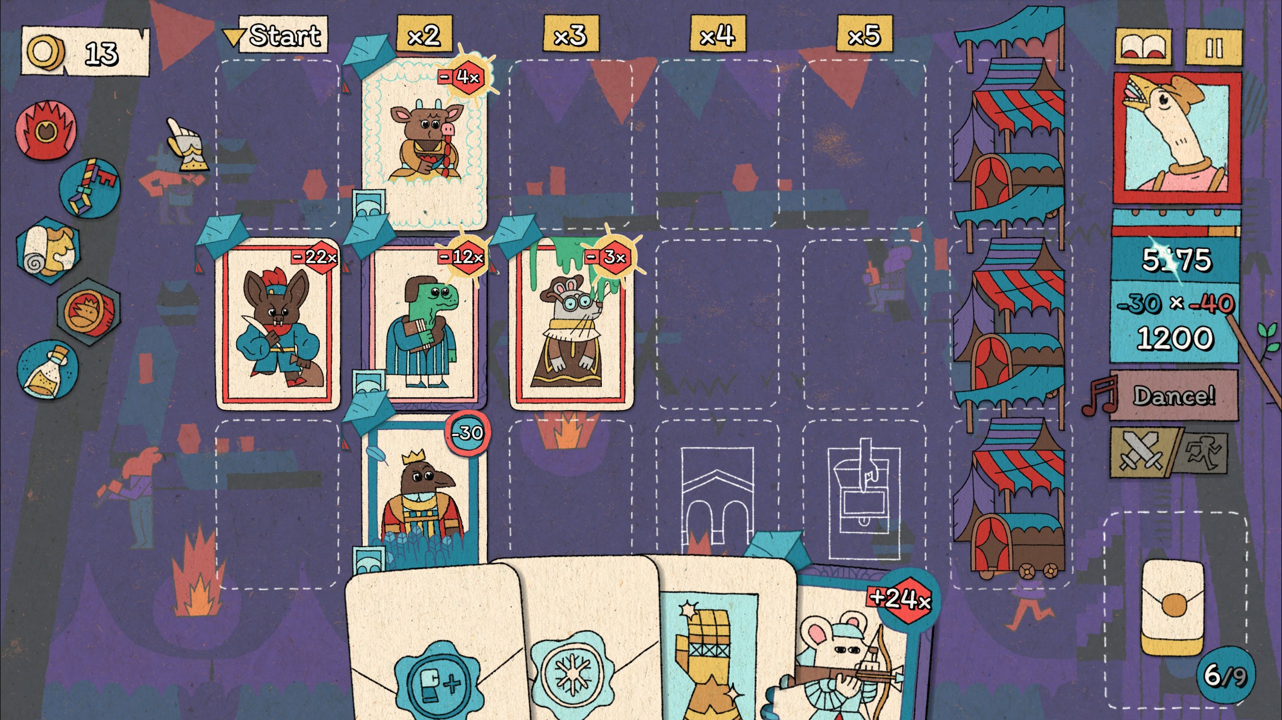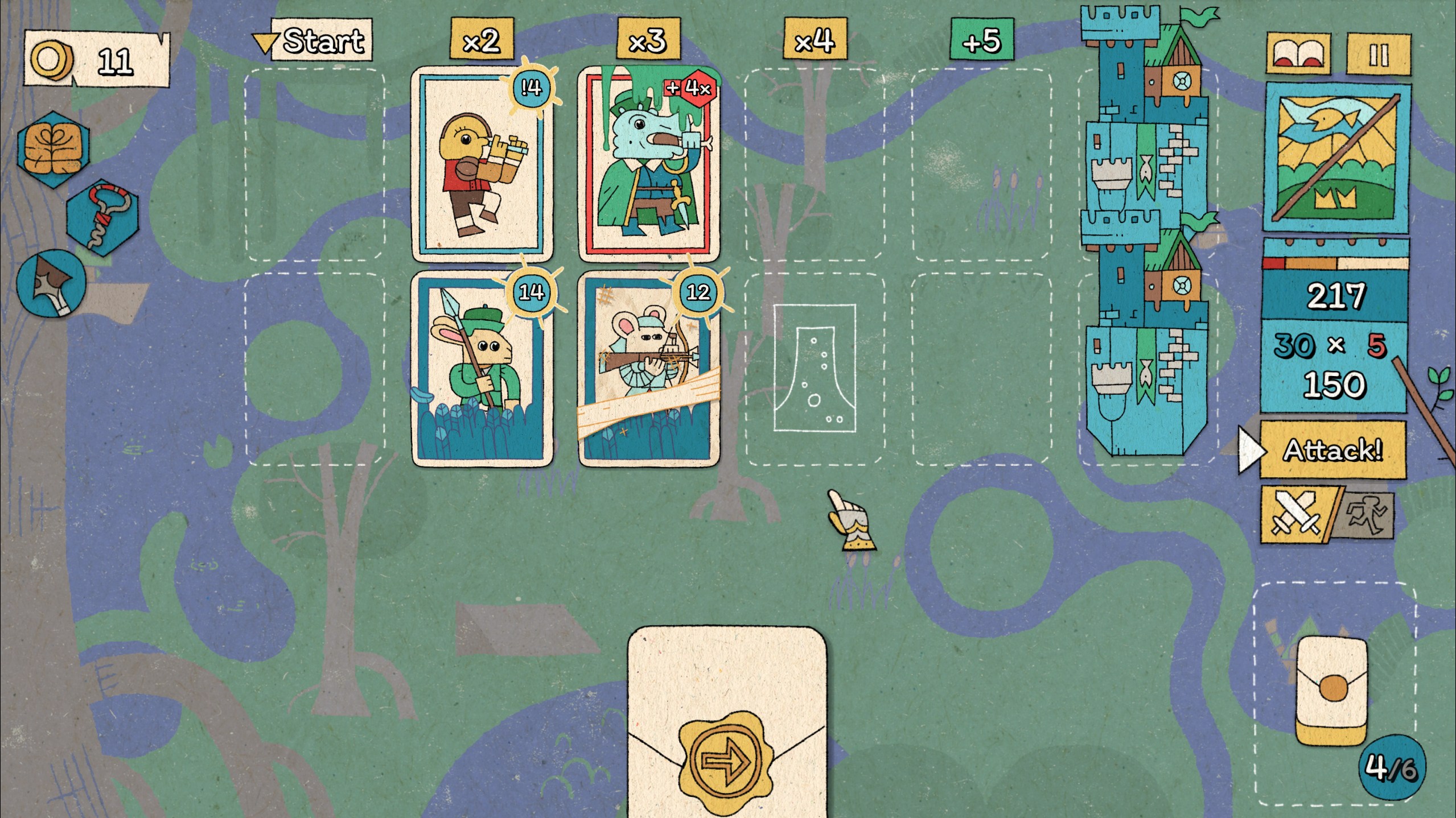 Quand un sujet ne répond pas à l’invitation, quelque peu forcée, de notre bien-aimée majesté, la question ne se pose pas. Un petit siège n’a jamais fait de mal à personne. C’est ainsi que l’on s’embarque dans une aventure aux côtés de l’armée du roi et quelques recrues récupérées en chemin. The Royal Writ est un jeu d’apparence assez simple et enfantine, dans lequel l’on dépose des cartes sur différentes lignes. Un bouton permet de terminer le tour, et le décompte des points gagnés est affiché, un jeu d’enfant.