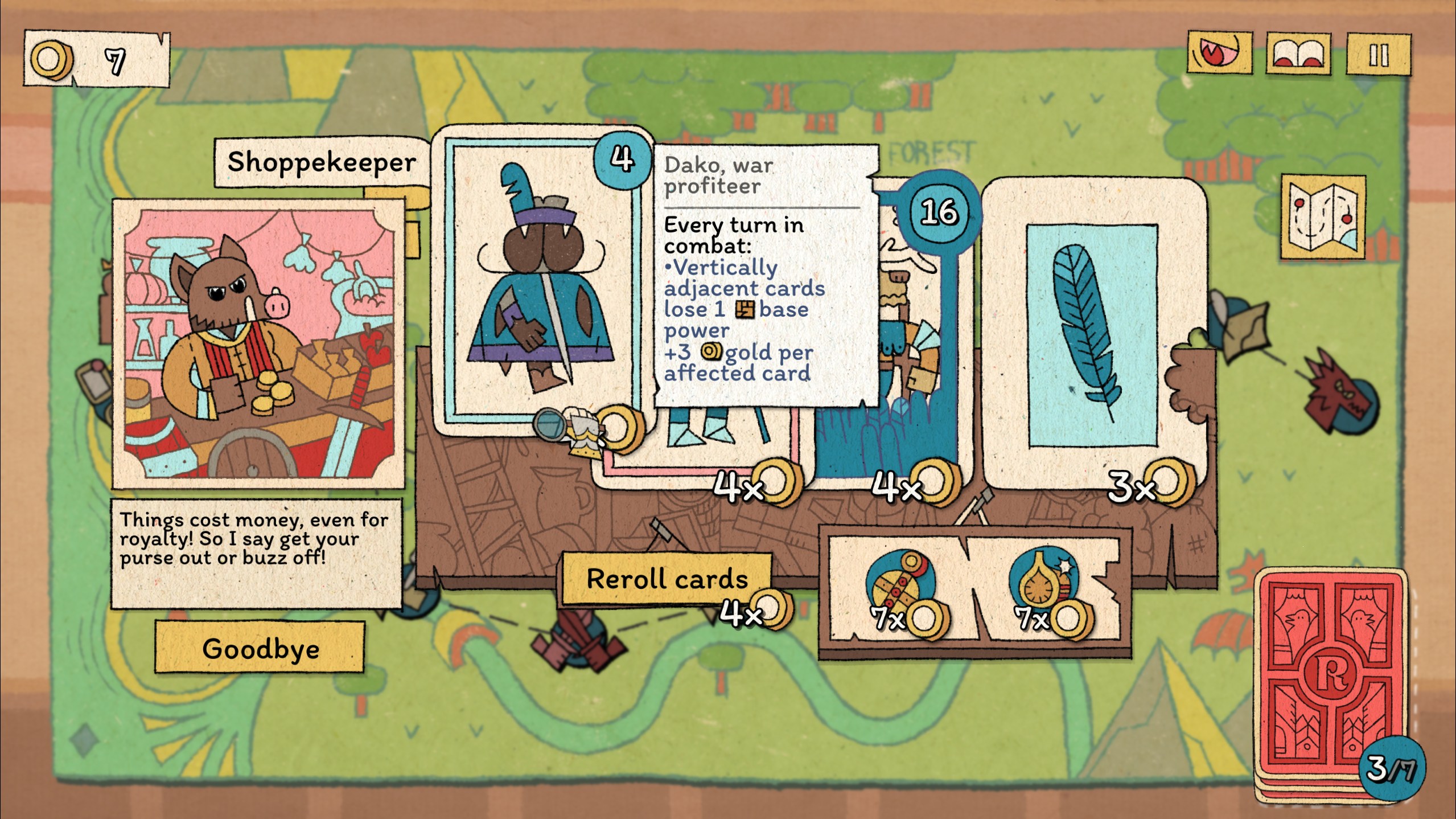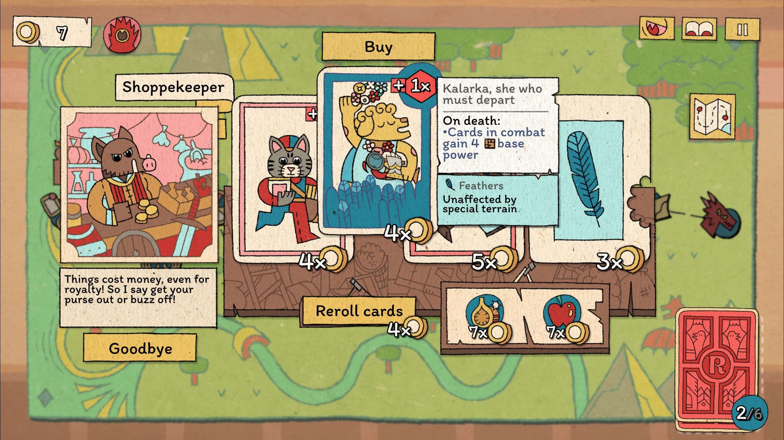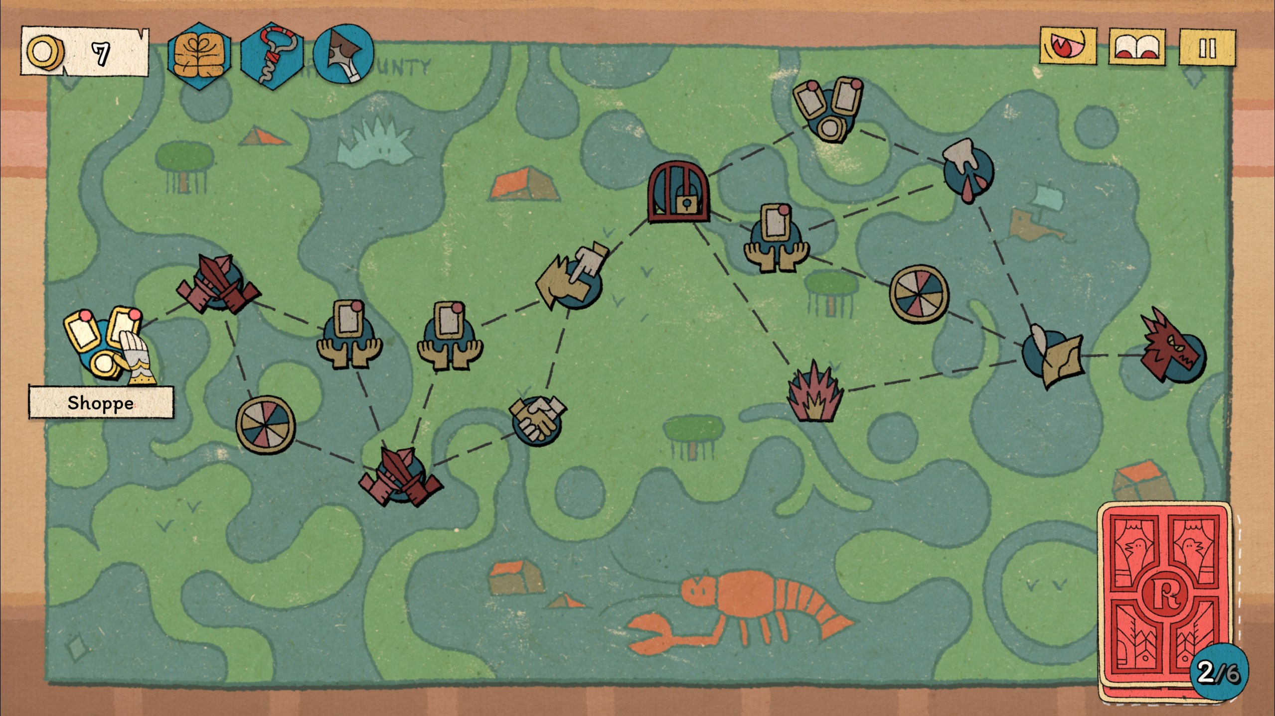 Ajoutons à cela les événements que l’on rencontre en chemin, qui permettent d’acquérir de nouvelles cartes, mais aussi de collectionner des améliorations passives ou de dépenser notre précieuse bourse d’or de diverses manières. Il y a de quoi faire, expérimenter et échouer. Oui, vous allez échouer régulièrement, mais rassurez-vous, tout est fait pour simplifier la compréhension.