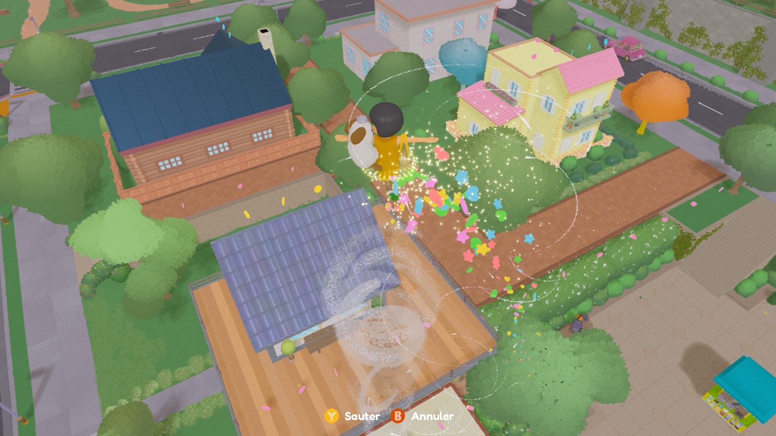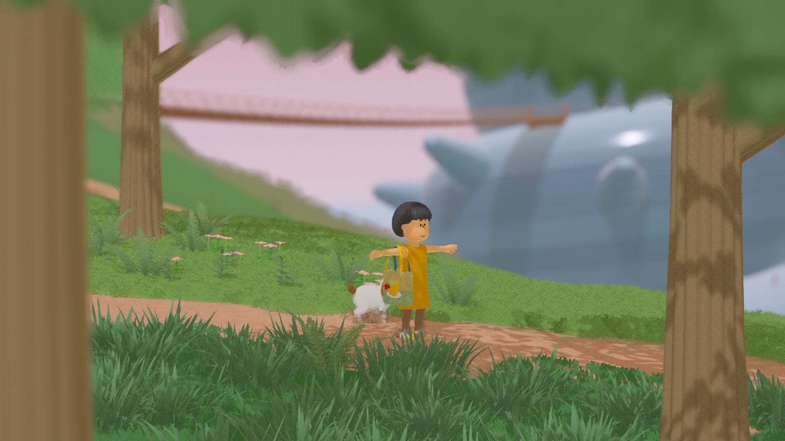 Le jeu est divisé en plusieurs chapitres, chacun symbolisé par un ballon de baudruche à trouver sur la map. Plus qu’un élément d’UI, les personnages ont conscience que ces objets sont présents dans leur monde et qu’ils font avancer l’histoire en les touchant. To a T brise régulièrement le quatrième mur : l’Ado salue le joueur depuis sa fenêtre chaque matin, les arbres se poussent d’eux-mêmes pour nous dégager le champ de vision… Comme si les personnages avaient parfois eux-mêmes conscience d’être dans un jeu vidéo, ce qui renforce cette atmosphère si particulière.
