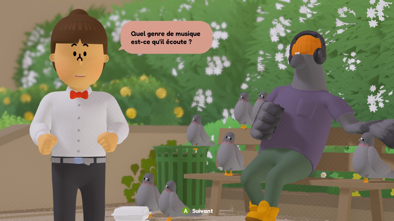 Et autour de ça, un monde totalement loufoque : des girafes qui tiennent des stands de nourriture, un DJ pigeon, de la sorcellerie, une forêt de champignons géants… Et une chorale qui vient ponctuer le récit, tel un chœur antique commentant les événements. Tout ce petit monde cohabite dans une ville en bord de mer, un univers coloré et acidulé, et on se demande bien pourquoi un Ado en T-pose étonne plus les habitants qu’un crabe qui tient un salon de coiffure ou qu’une gazette écrite par une coccinelle.