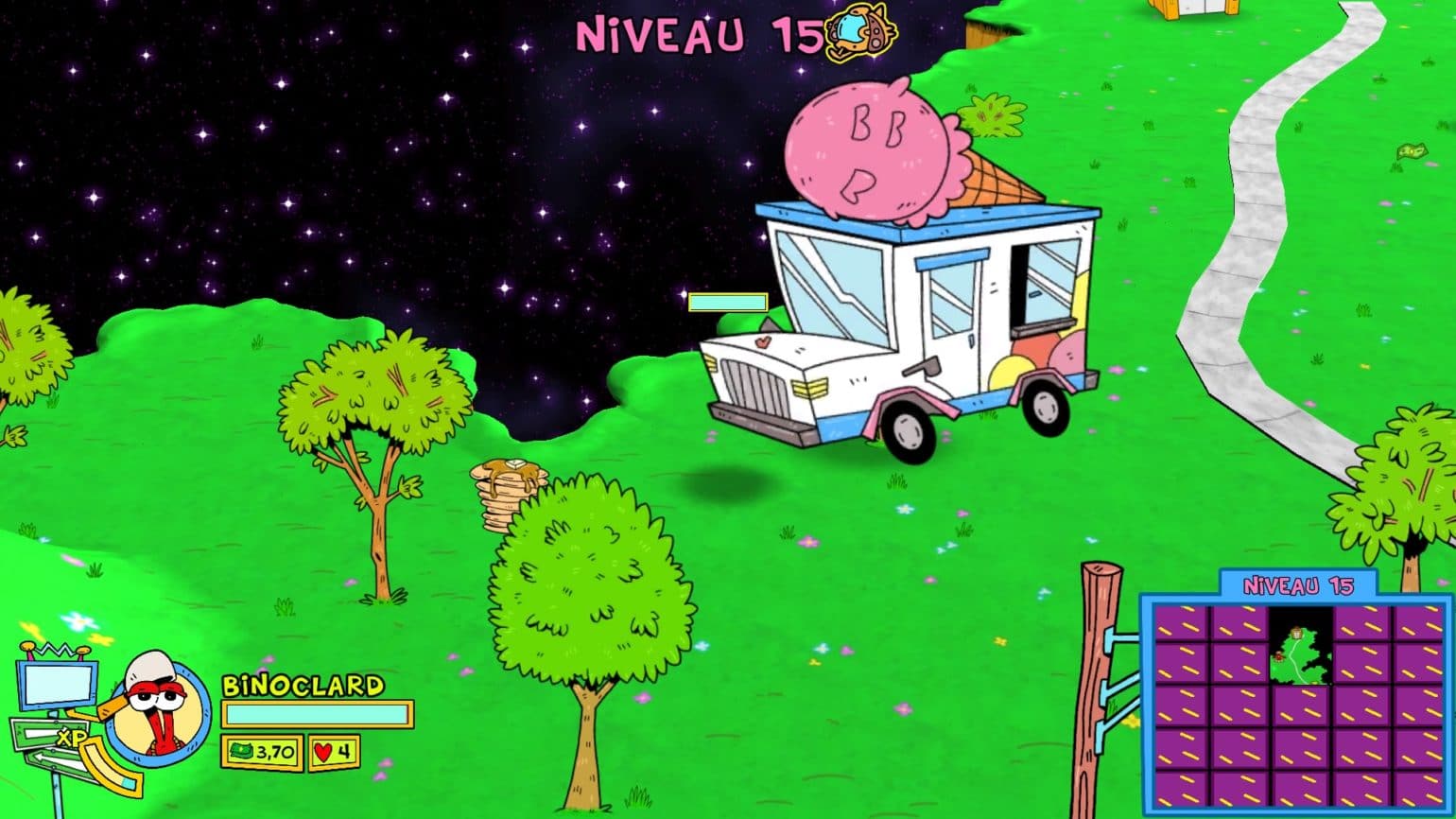 Le jeu démarre avec un mode « niveaux fixes », c’est-à-dire non aléatoires. Le mode aléatoire ne s’ouvre qu’après avoir atteint le niveau 10 en « fixe ». C’est l’une des différences notables avec le ToeJam & Earl original, qui ne se jouait qu’en procédural. D’ailleurs, les différences avec son aîné, c’est le principal souci du jeu : il n’y en a presque pas. Cette histoire de niveau fixe, donc, anecdotique ; l’ajout d’un mode multi online (alors qu’on est clairement face à un jeu qui devrait se jouer en multi canapé) ; et c’est tout. Pour le reste, c’est exactement le même jeu qu’en 1991. A tel point qu’on pourrait regretter le lissage graphique, tant le sentiment de jeu rétro aurait collé aux pixels très réussi de l’époque.