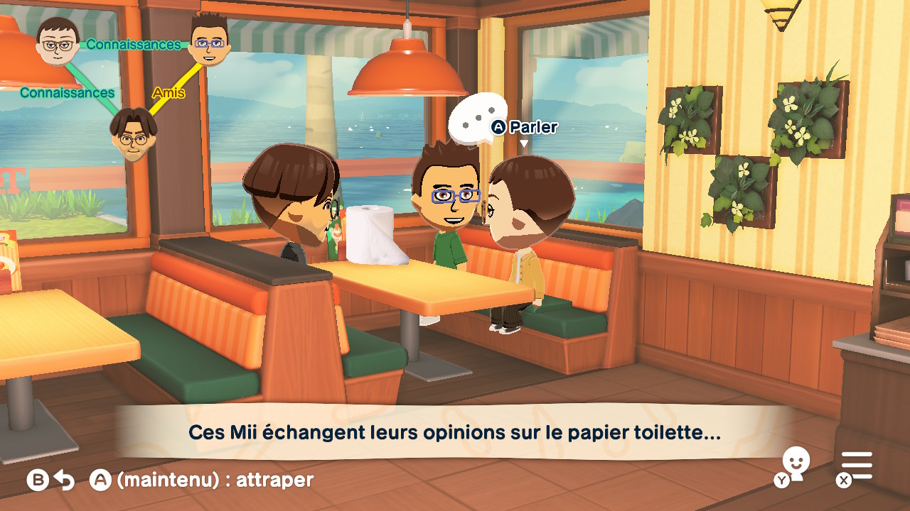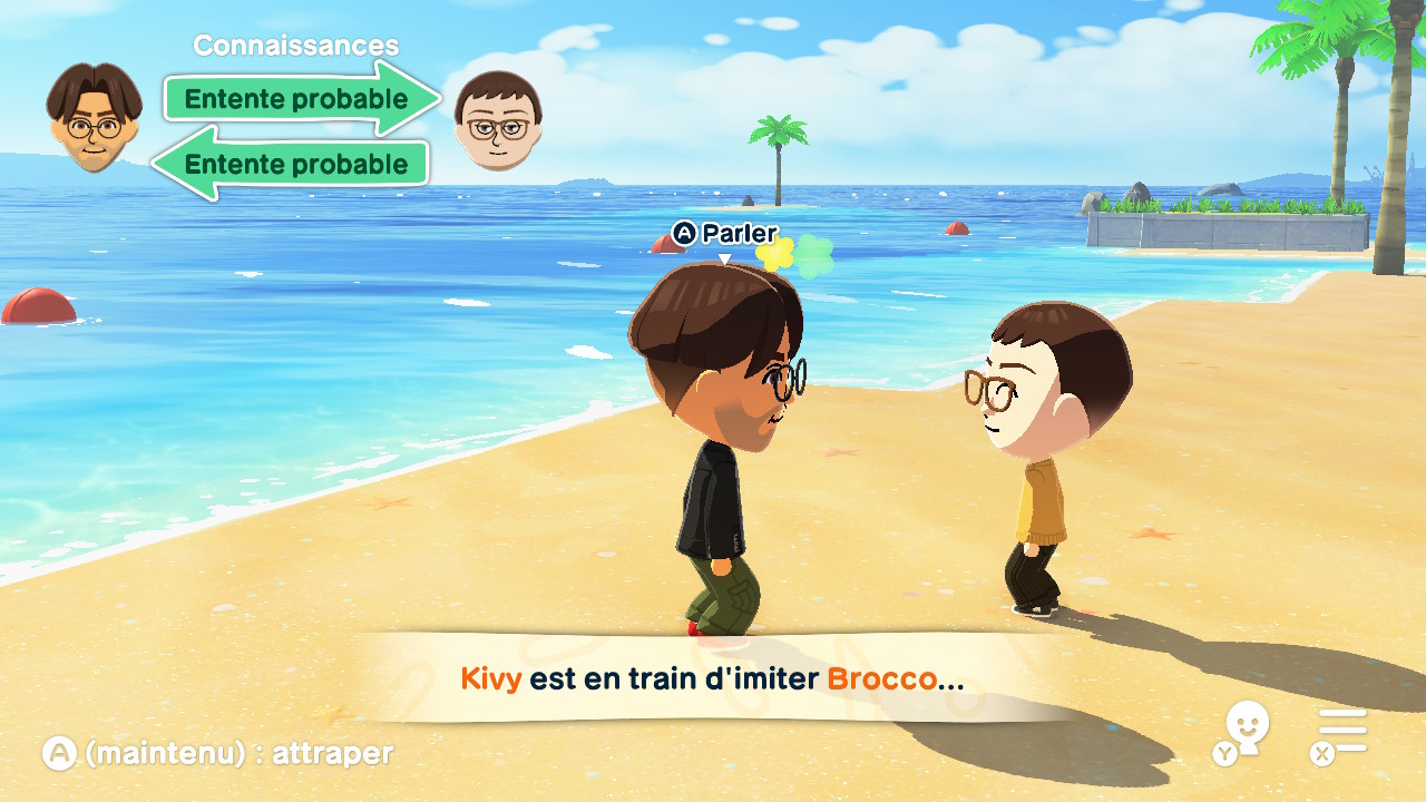 On s’amuse donc à voir ses amis interagir avec ses personnages de fiction favoris ou avec des célébrités, dans des situations toujours complètement loufoques. Au fil du jeu, le « lexique de l’île » s’étoffe avec les mots et expressions qu’on aura nous-mêmes écrits, et que les Miis utiliseront naturellement dans leurs conversations. C’est un plaisir de découvrir sans cesse de nouvelles petites scènes, de voir des amitiés improbables se créer ou d’assiter à la formation de triangles amoureux.