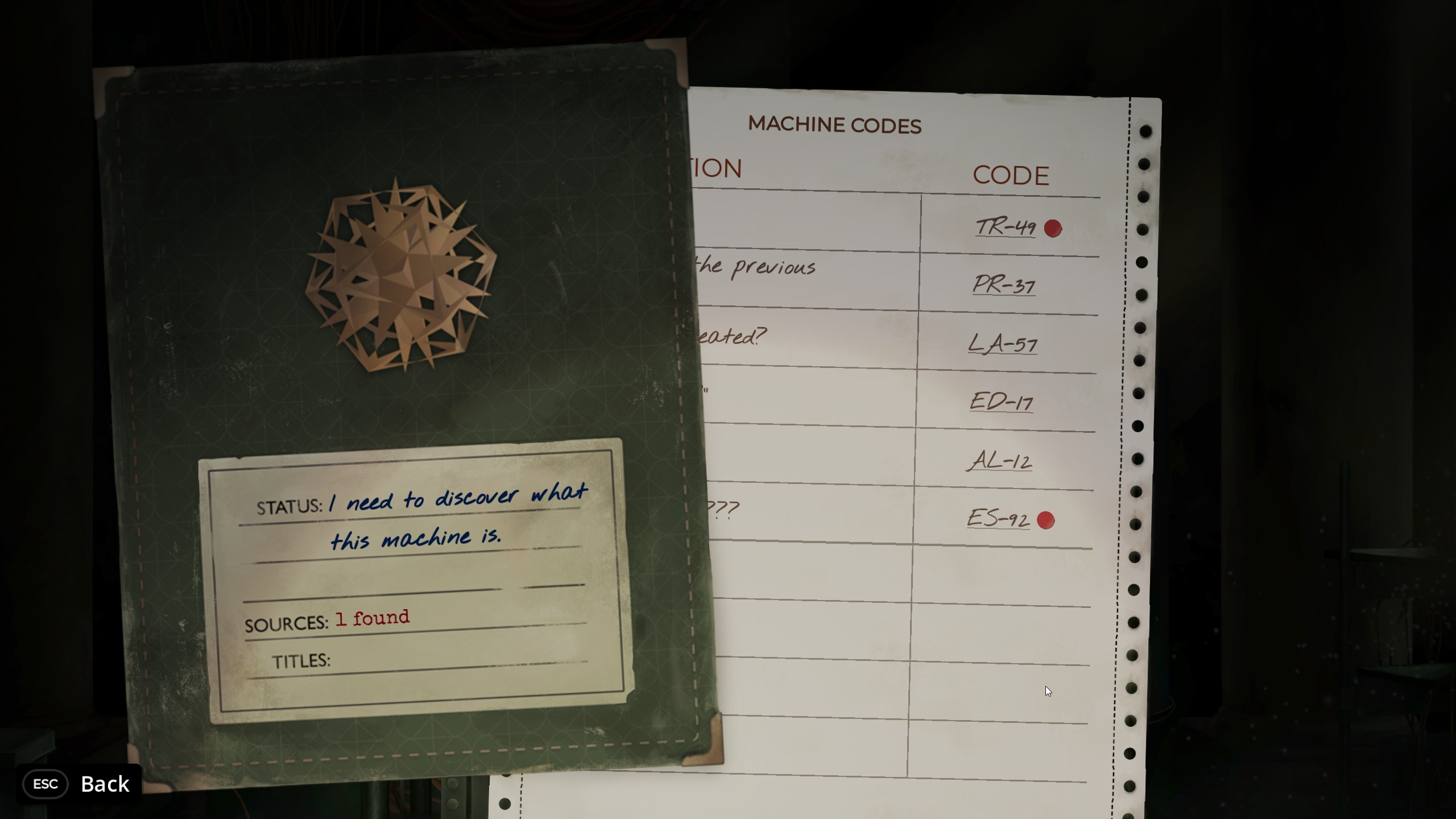 TR-49 est un titre assez simple dans sa construction générale : on nous place aux commandes d’une machine dont les différentes sources écrites ont manifestement été perdues. Pourquoi ? Comment ? Ce sera à nous de le découvrir. À l’aide d’un petit clavier circulaire (ou du clavier du joueur sur PC), on entre différents codes composés de deux lettres et deux chiffres, comme TR-49.