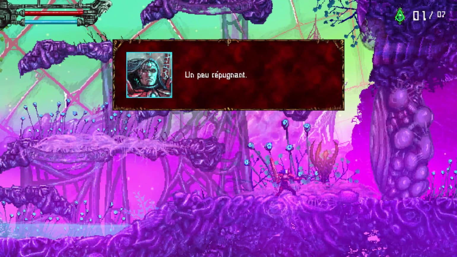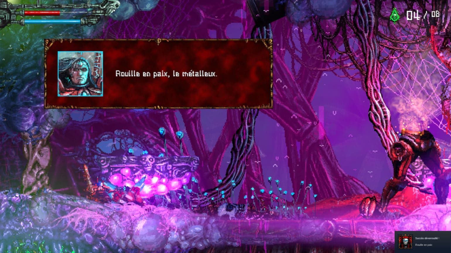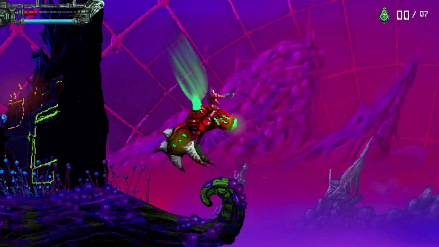 Aucun doute possible, on est bien face à un jeu néo-rétro. Certes, les bases du gameplay, le pixelart et la linéarité de la map nous ramènent aux action-platformers de la fin des années 80, comme Turrican ou Gryzor (Contra), avant même que le metroidvania ne viennent renouveler la recette.