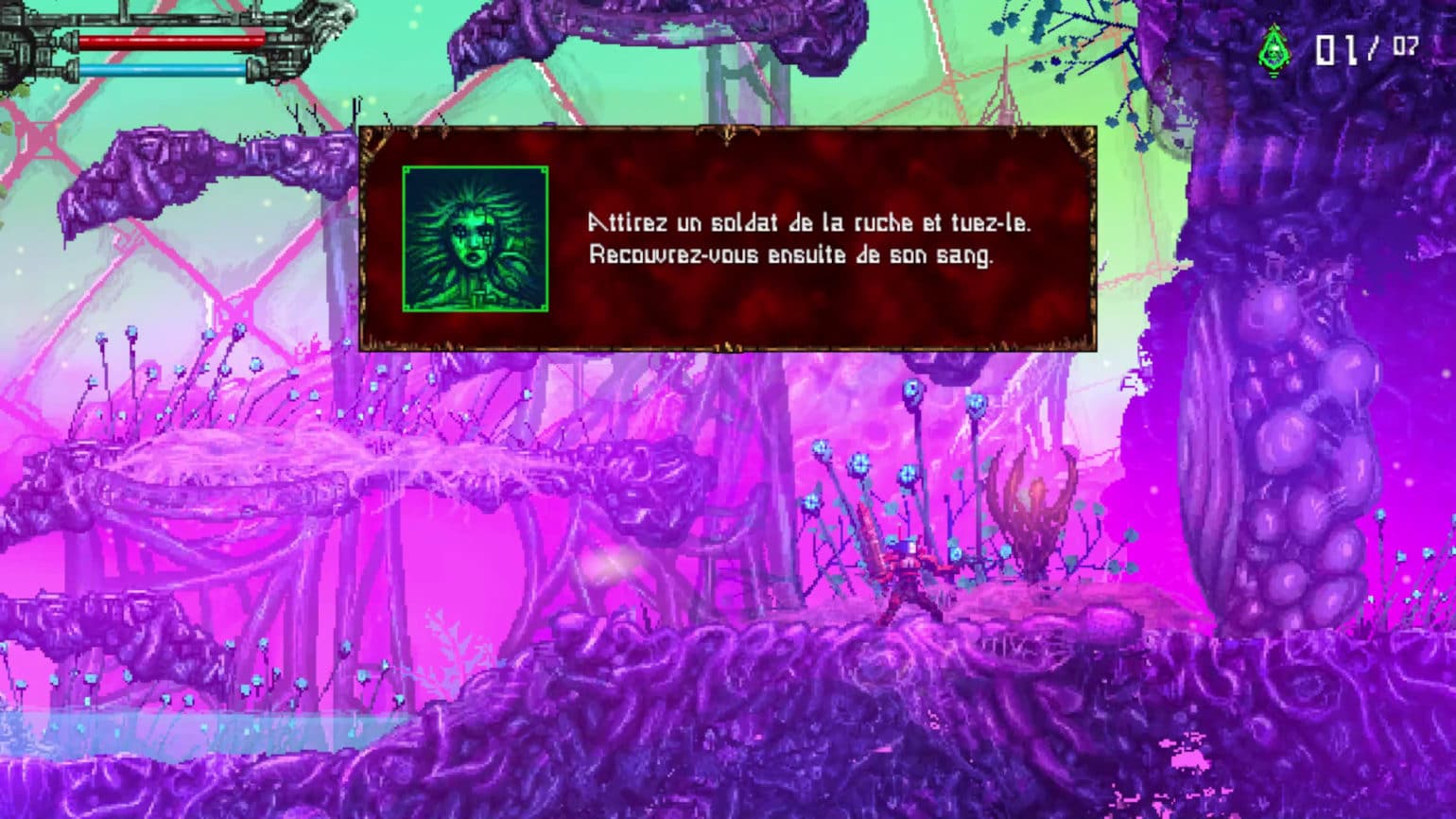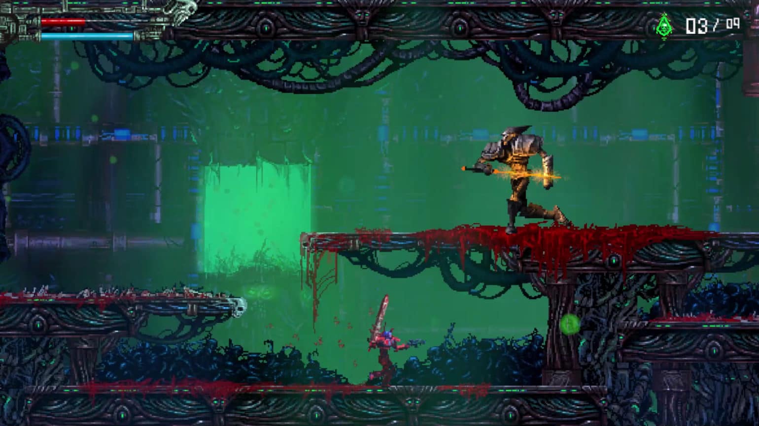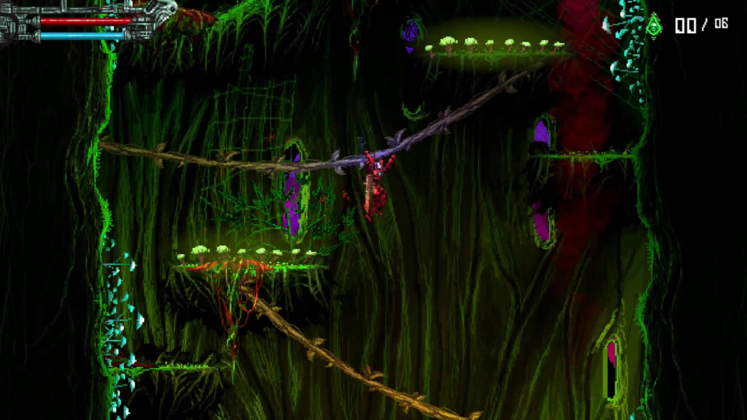 Aucun doute possible, on est bien face à un jeu néo-rétro. Certes, les bases du gameplay, le pixelart et la linéarité de la map nous ramènent aux action-platformers de la fin des années 80, comme Turrican ou Gryzor (Contra), avant même que le metroidvania ne viennent renouveler la recette.