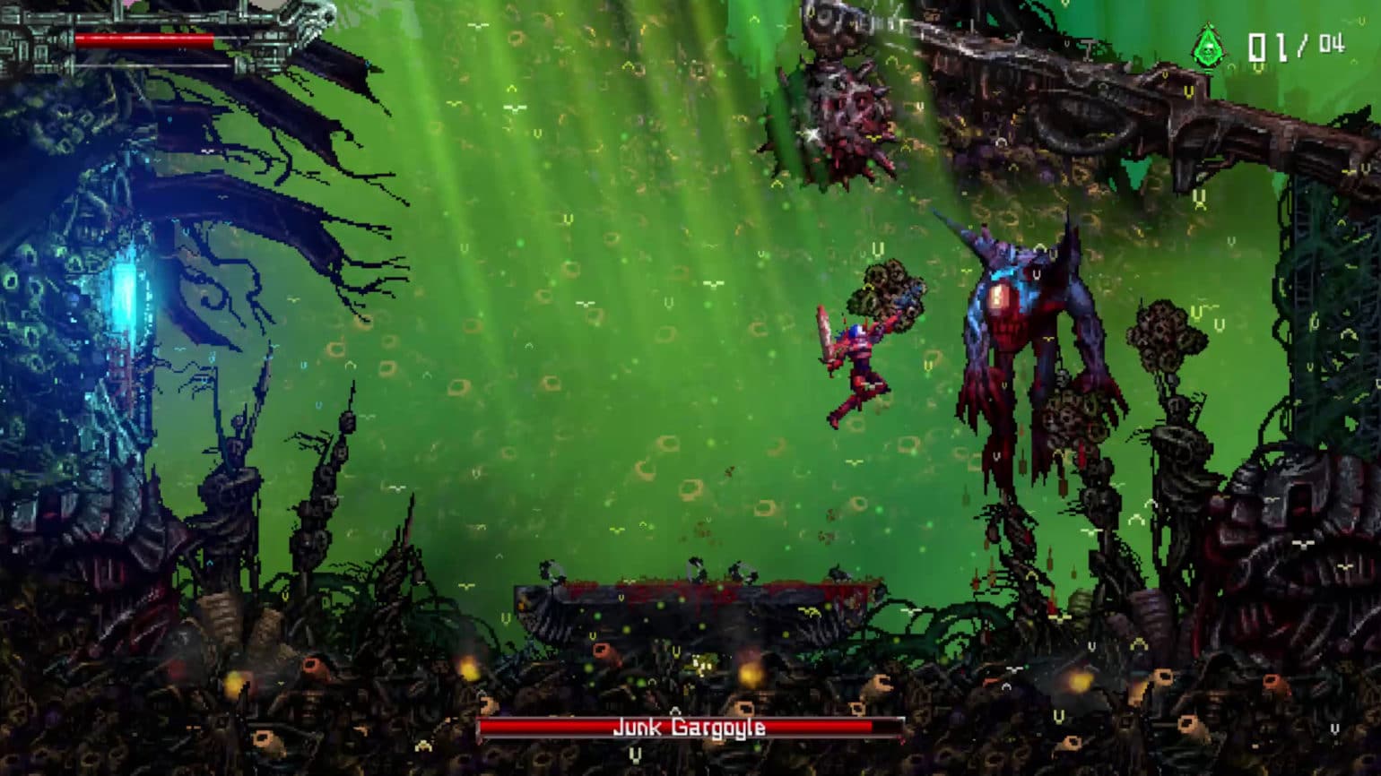 Et il n’y a pas que graphiquement que le titre se révèle bien ancré dans son temps. On meurt beaucoup et souvent dans Valfaris, parfois même à seulement quelques secondes d’intervale. Mais on ne respawn jamais très loin. Nous ne sommes pas en 1991 où il s’agissait de refaire l’ensemble d’un niveau à chaque fois qu’un boss remportait le combat… Ici, des points de sauvegarde sont disséminés à chaque point clé, après chacune des grosses difficultés rencontrées dans le jeu.
