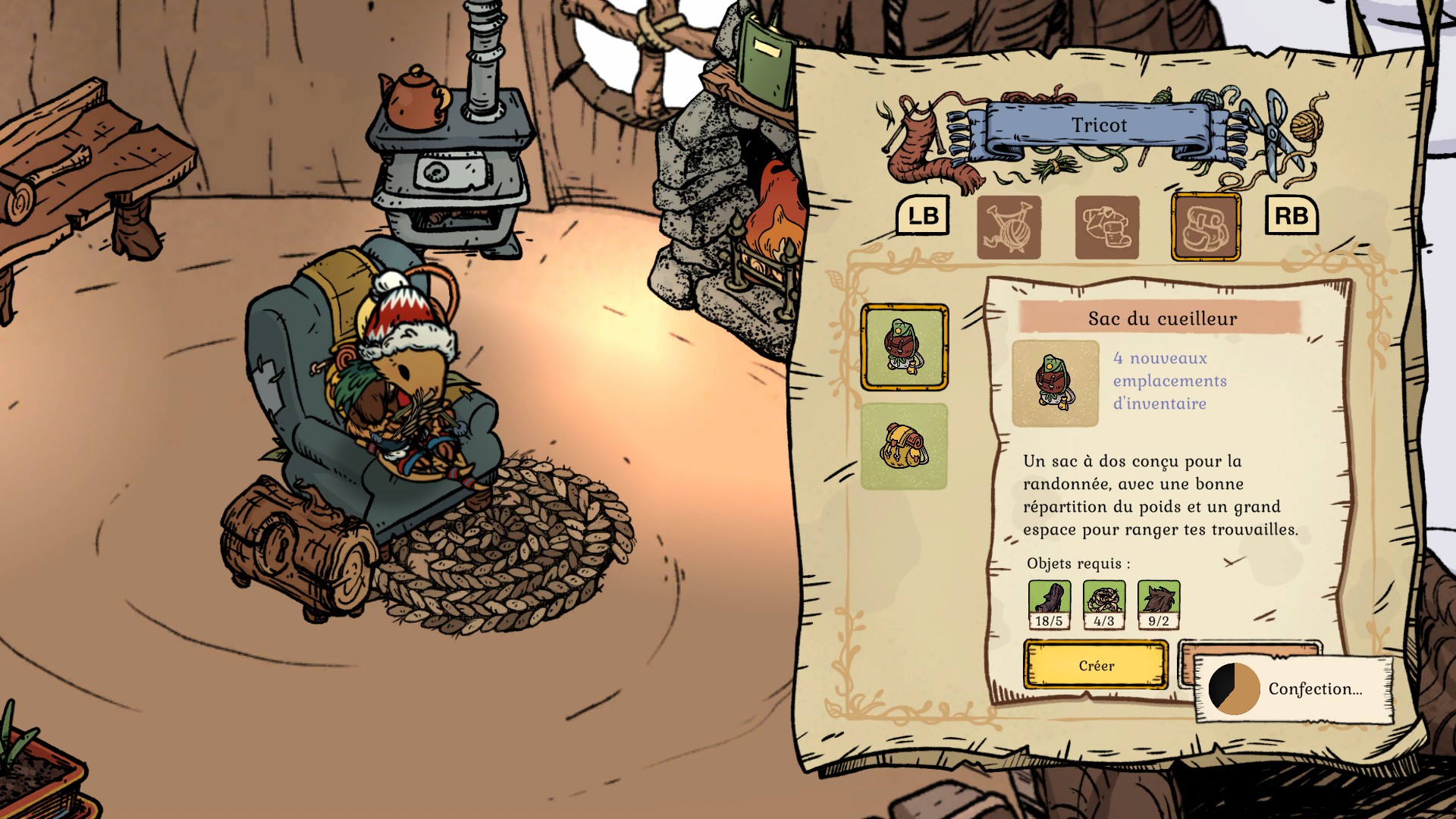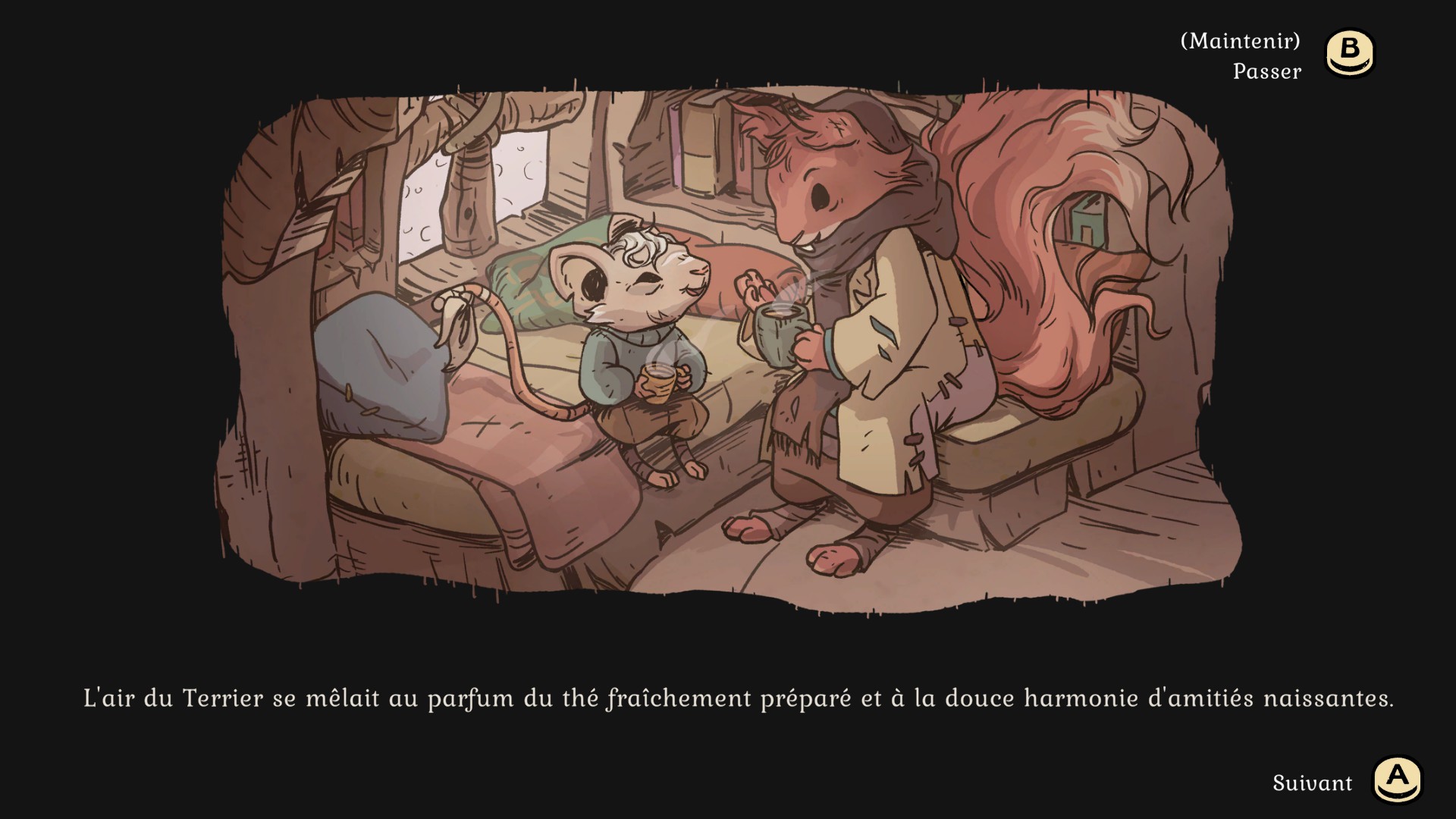 Les graphismes et l’ambiance générale rappellent des livres comme Le Vent dans les Saules de Kenneth Grahame, les illustrations de Beatrix Potter ou encore le film Brisby et le Secret de NIMH. Au fur et à mesure de la partie, on débloquera aussi des meubles à fabriquer pour créer la décoration douillette de nos rêve dans notre terrier. Sur cet aspect, le jeu est vraiment plaisant.
