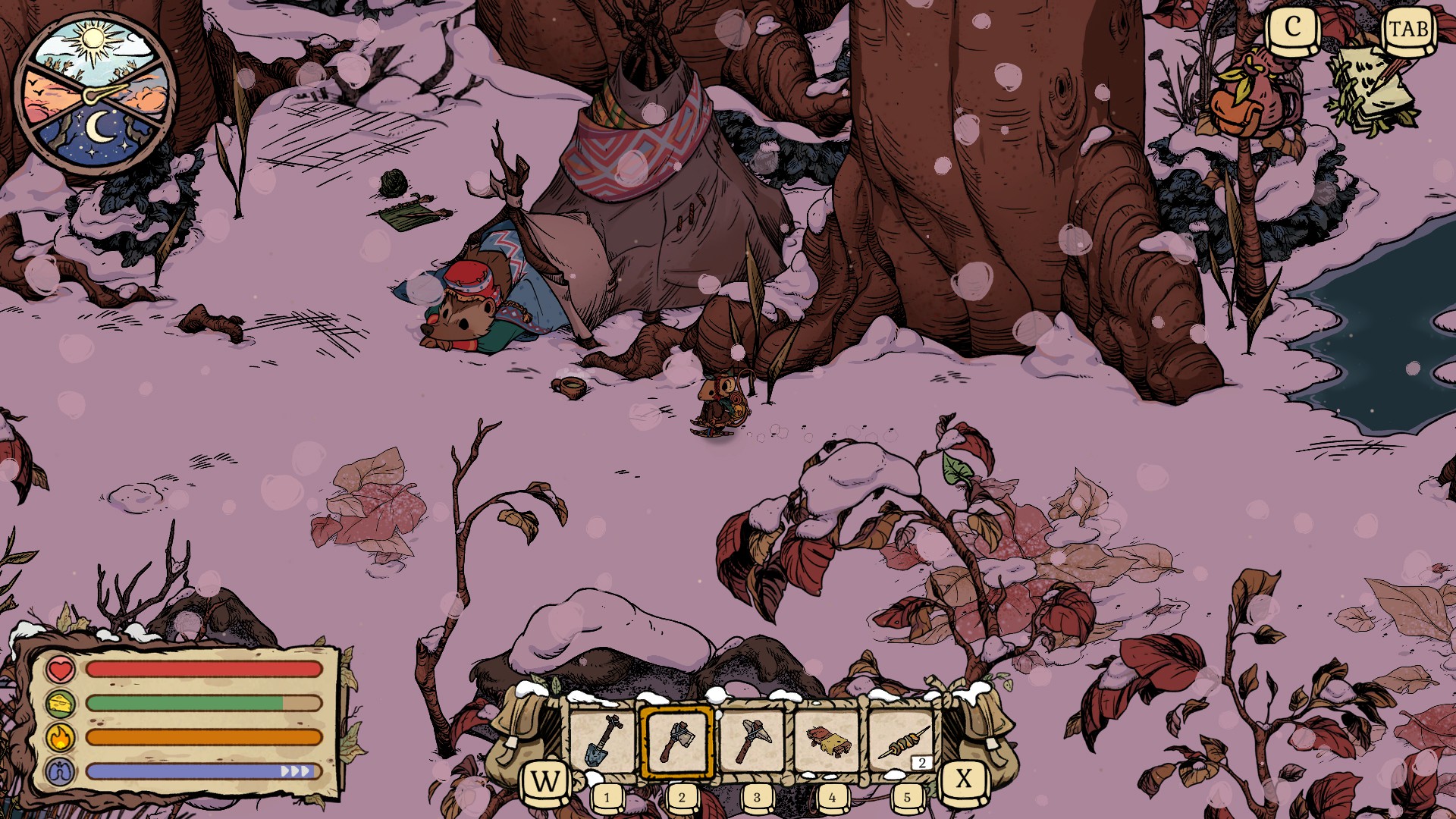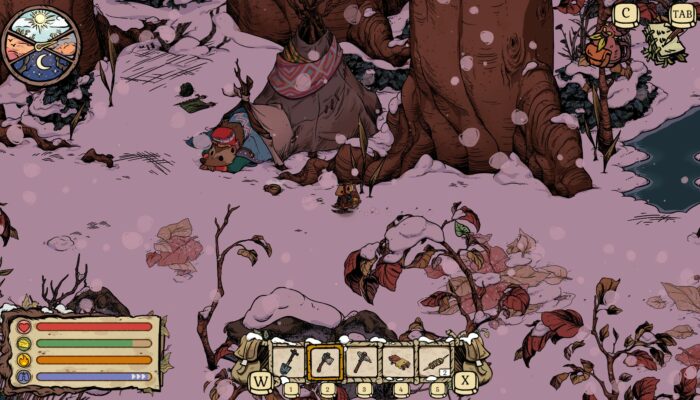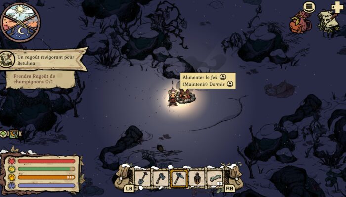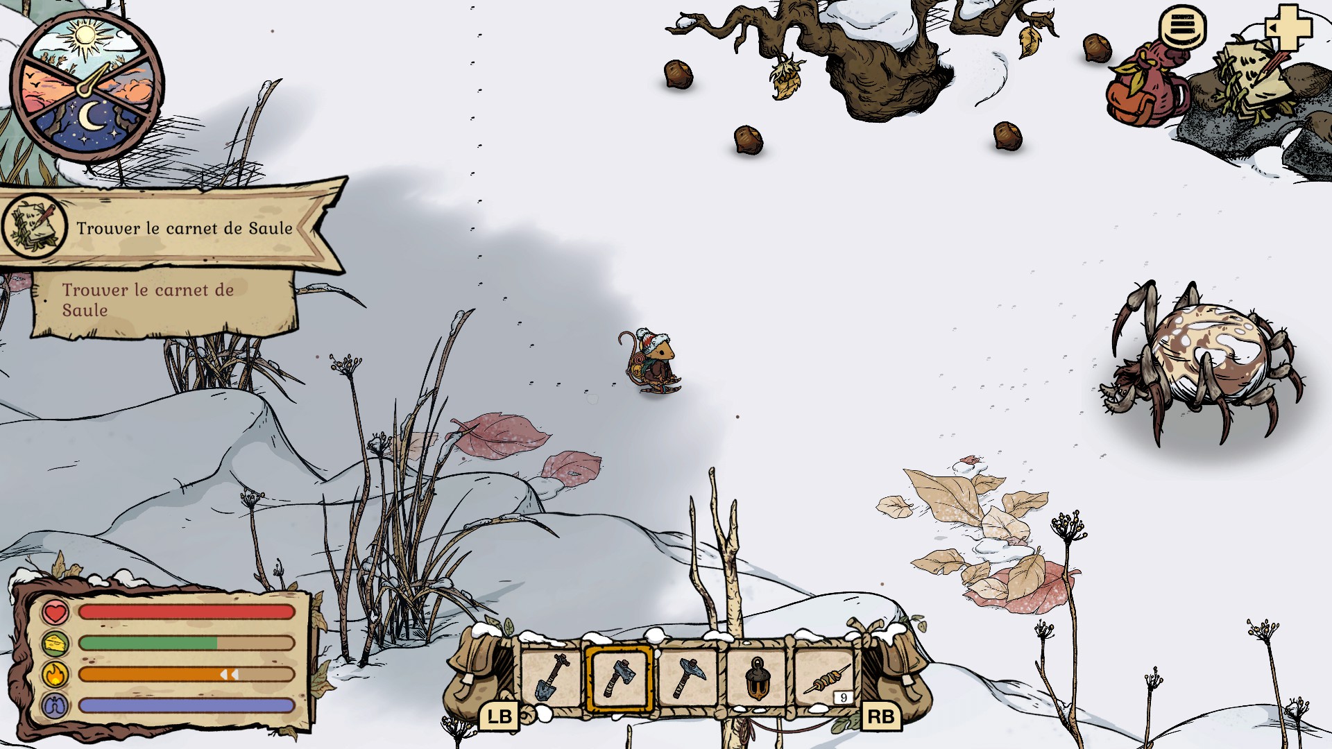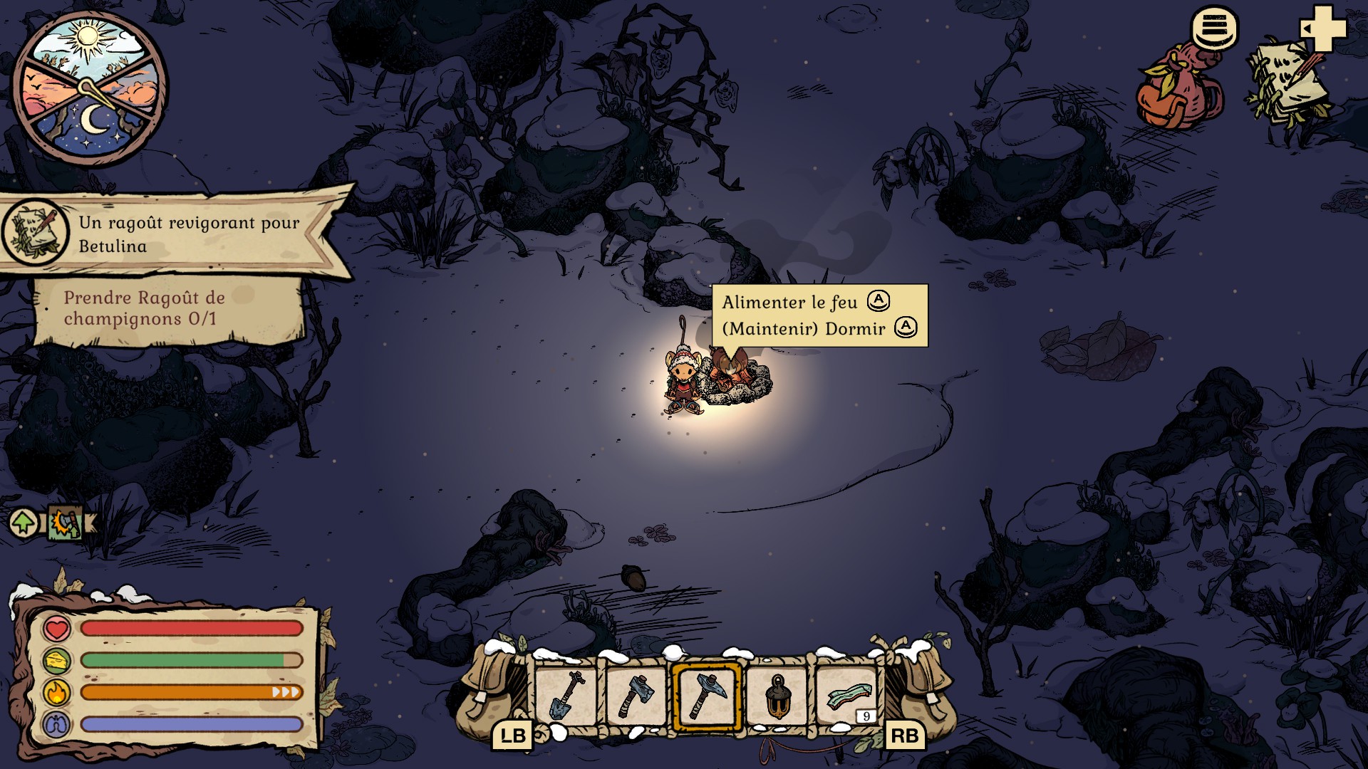 Car en plus d’être un jeu mignon et bienveillant, Winter Burrow est avant tout un jeu de survie. Il faut garder l’œil sur plusieurs données tout au long de la partie (la santé, le froid, la faim et la fatigue), et s’assurer d’être bien préparé avant chaque exploration. Une balade qui dure trop longtemps sans venir se réchauffer près d’un feu de camp peut être fatale, tout comme un combat contre une araignée.