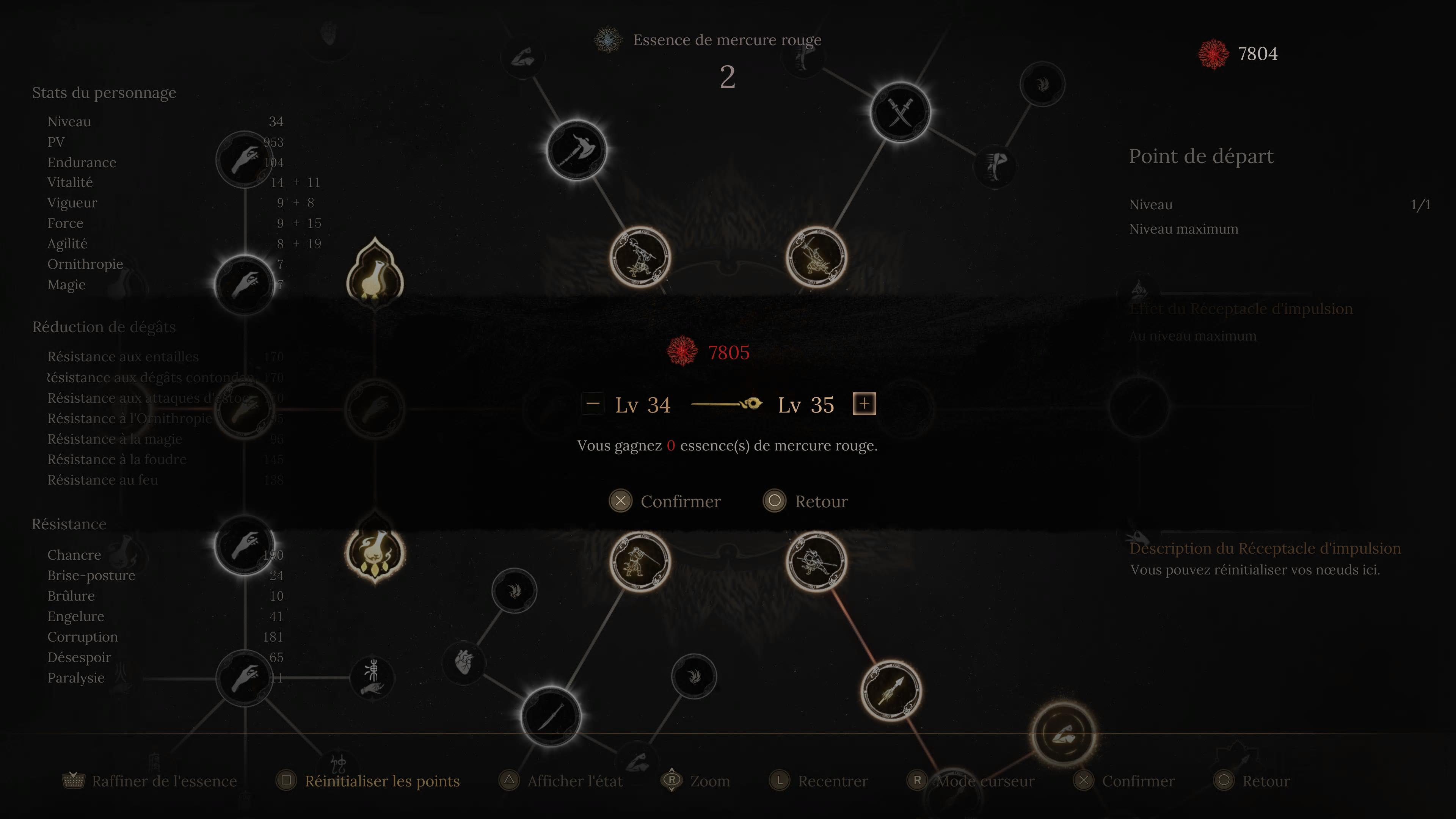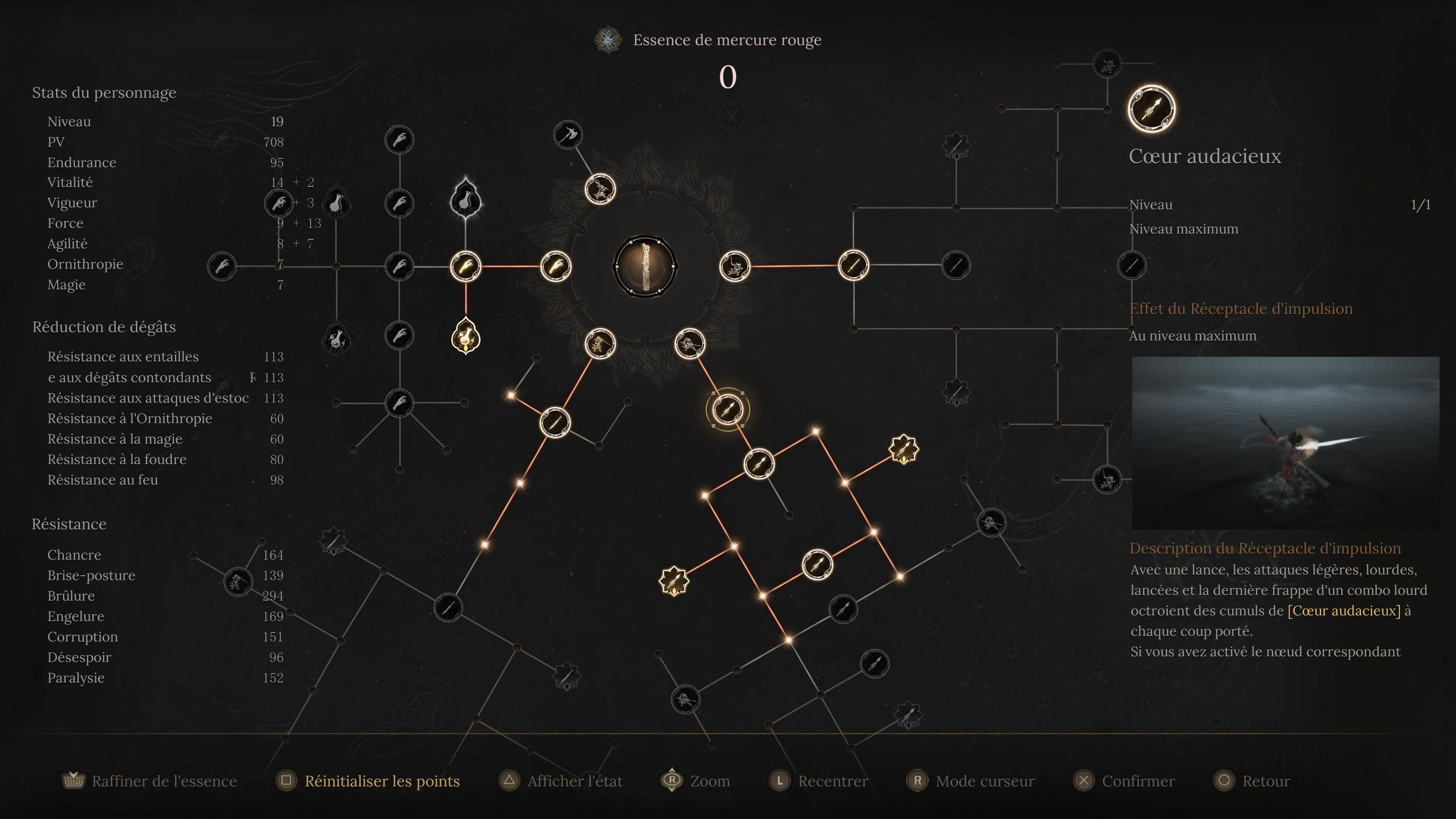 Au premier rang d’entre eux, nous avons envie d’évoquer l’arbre de talent. Dans Wuchang: Fallen Feathers, la montée de niveau ne nous permet pas d’attribuer des points de caractéristique comme il est de coutume dans le genre mais nous offre un point à utiliser sur une sorte de sphèrier. Le cœur de notre évolution est là, que ce soit en termes de statistiques (vie, magie, agilité, force…), en compétences, en augmentation de niveau d’arme ou de potion… Mais encore une fois, tout est terriblement mal expliqué.