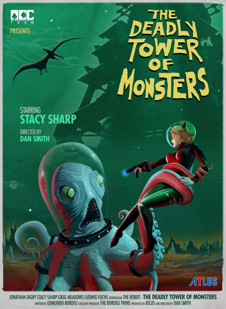 Le jeu indépendant sort souvent des sentiers battus avec des concepts étranges mais sait parfois ajouter simplement une petite pincée de délire à un concept pour en faire quelque chose de vraiment sympathique. The Deadly Tower of Monsters pourrait rentrer dans cette catégorie puisque le titre vous propose d’incarner un trio de héros (Jonathan Digby, Stacy Sharp et un acteur inconnu) sur le tournage d’un film supervisé par Dan Smith. Axé science-fiction, le film en question propulse nos trois héros au pied d’une immense tour de la planète hostile Gravoria après le crash de leur navette.