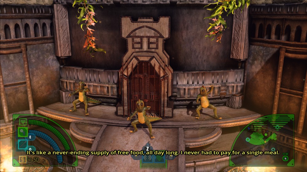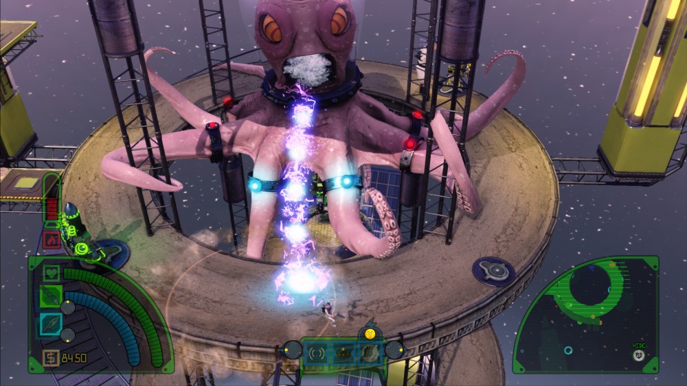 Il vous faudra donc gravir la tour nommée The Deadly Tower of Monsters afin de défaire le despotique et cruel empereur de Gravoria. Mais ce ne sera pas une partie de plaisir puisque tout un tas de monstruosités vous attendent. Entre aliens scientifiques, singes, dinosaures et poulpe géant vous aurez de quoi utiliser votre blaster. De nombreuses armes seront à votre disposition tout au long de votre ascension avec également de nombreux trésors et lieux cachés. Vous pourrez régulièrement voir la hauteur à laquelle vous êtes puisqu’une grande partie de la tour n’est pas fermée. Libre à vous de sauter aux étages inférieurs.