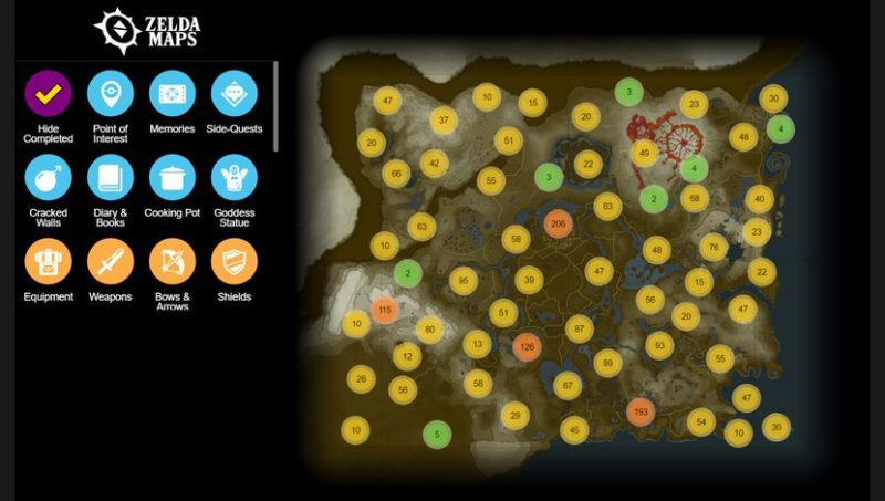 C’est là que les gens des sites Hyrule Legends et Zelda Universe se sont associés pour créer une carte interactive regroupant tous les éléments du jeu. Oui, tous ! Des fragments de mémoires que Link doit récupérer à l’emplacement des 120 sanctuaires en passant par celui des innombrables noix Korogu mais également les emplacements des statues de la déesse, des grandes fées et des différents monstres qui peuplent le royaume, tout ce qui pourrait vous être utile dans votre exploration y est recensé.