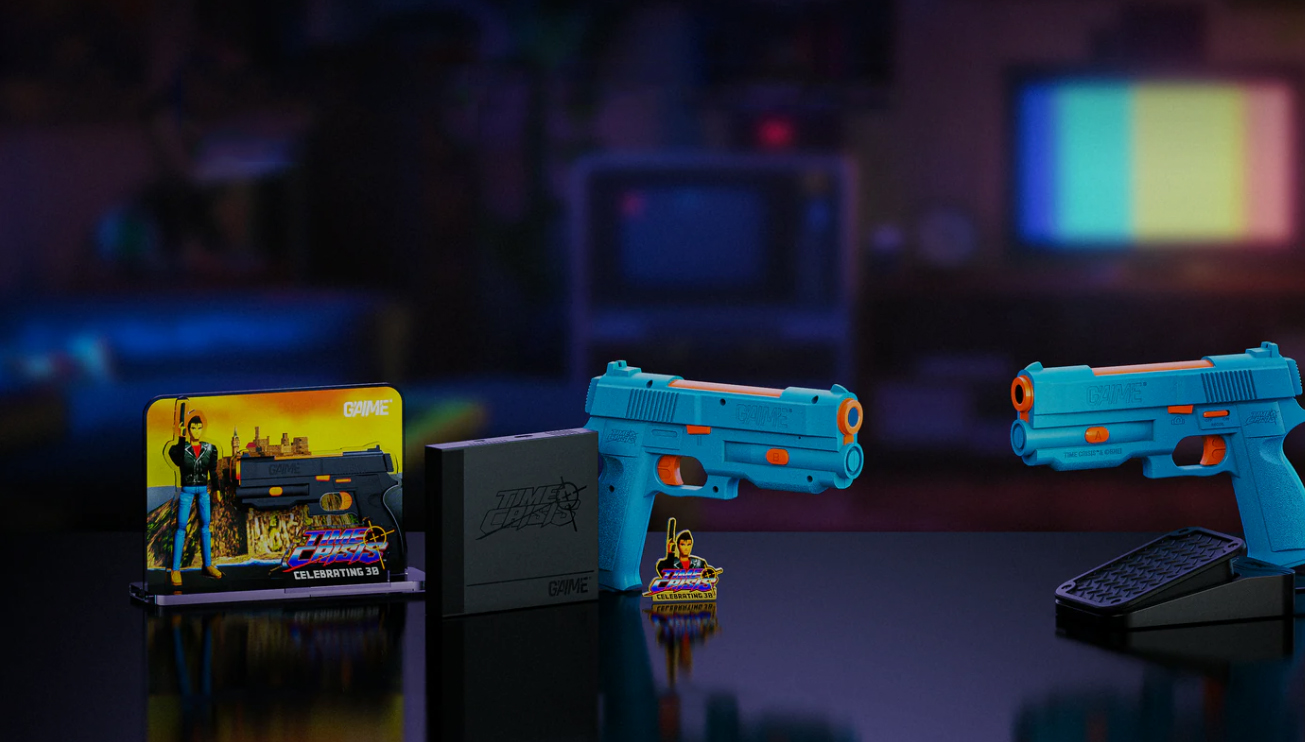 Mais réjouissez-vous, amateurs de ball trap numérique ! Pour les 30 ans de Time Crisis, une mini-console et son light gun compatible avec nos écrans contemporains font leur apparition. Proposé par une marque créée pour l’occasion, G’AIM’E (to aim en anglais signifiant « viser », vous voyez le jeu de mots…), sous licence officielle Bandai Namco, ce retour de Time Crisis se présente sous la forme d’un petit boitier plug and play à brancher à sa télé, sur lequel on connecte via USB-C un light gun équipée d’une technologie le rendant compatible avec nos équipements d’aujourd’hui, et reprenant fidèlement le design de celui de la borne d’arcade.