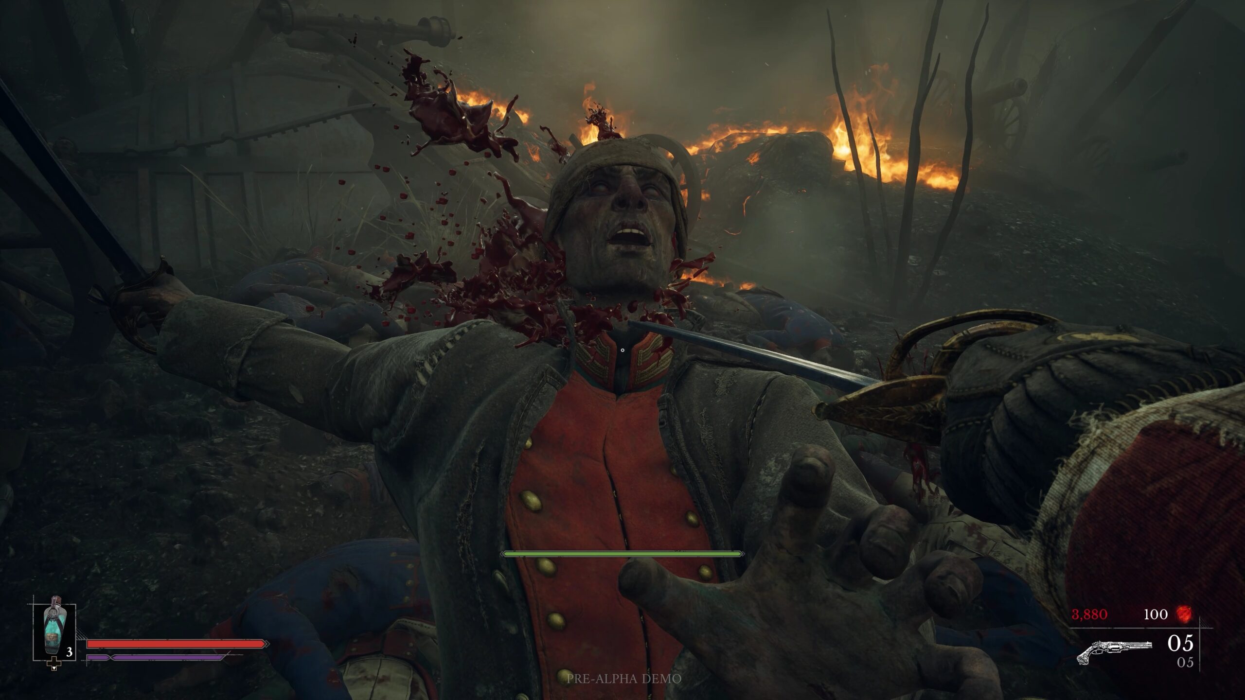 Qui dit XIXème siècle dit sabres et pistolets, ça tombe bien car c’était les seules armes disponibles de cette démo. Aucune surprise du côté de l’arsenal, le sabre ne disposant que d’un seul type de combo d’attaques légères, plus rapides et efficaces après une esquive parfaite, et d’un coup puissant. Il est également possible de parer ou de dévier les attaques afin de remplir une jauge d’étourdissement dans le but de réaliser des finish moves, qui sont pour le coup, très réussis et ont le luxe de mettre au premier plan le design abominable de nos adversaires.